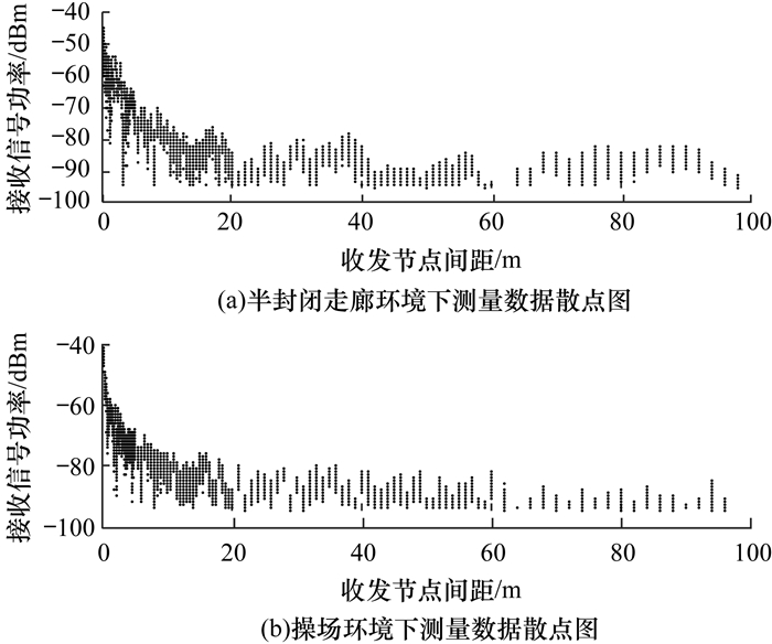 3 建模结果与分析不同收发节点间距下接收信号功率的原始测量数据如图 3所示。作为参考, 同时测量了完全开放的室外环境。室外环境选择了重庆理工大学操场, 这里地形平坦, 表面仅覆盖数厘米高的草坪。从图 3可以看出, 操场环境下的信号接收功率起始值要大于半封闭走廊。在0 m~20 m范围内, 2种环境下的接收功率波动均较为剧烈, 但20 m后半封闭走廊的波动要明显强于操场环境。这是因为随着传播距离的增加, 视距信号分量的强度不断衰减, 反射信号分量的作用逐渐明显, 而半封闭走廊环境下的反射信号分量要明显多于操场环境。对原始数据的初步分析表明, 接收信号功率与收发节点间距近似为对数关系, 因此可以采用对数距离接收功率模型对数据进行建模处理。