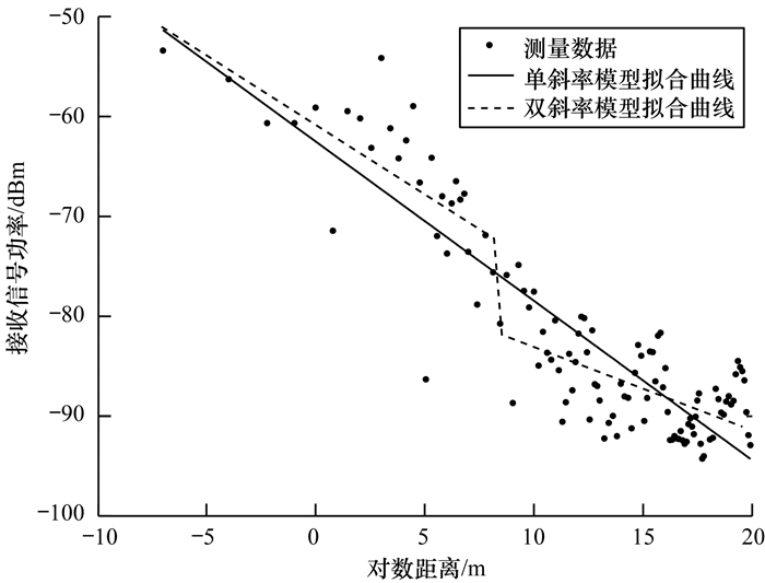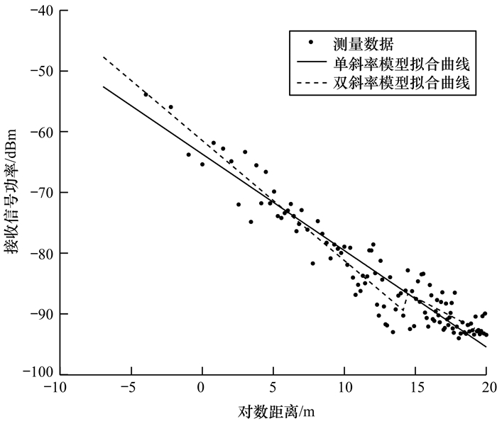 然后对半封闭走廊环境下的测量数据进行处理, 得到单斜率模型和双斜率模型的拟合曲线如图 5所示, 计算得到的模型参数如表 2所示。从图 5可以看出, 与操场环境相比, 半封闭走廊环境下的接收信号功率波动明显更为剧烈, 这也使得单斜率模型和双斜率模型的拟合效果均比操场环境差, 这从表 2中的评价指标也可得到验证。半封闭走廊环境的回归剩余标准差Sr比操场环境高1.5 dB左右, 而相关系数R2更小。就半封闭走廊环境自身而言, 双斜率模型的Sr更小, R2更大, 因此与完全开放的室外操场环境相同, 仍然是双斜率模型的拟合效果更好。