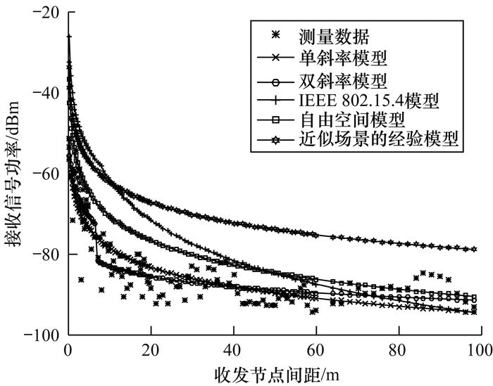 文献[15]给出的近似场景的经验模型对接收信号功率的预测值比自由空间模型还高。分析其测量环境可以发现, 完全封闭的走廊环境对无线信号传播产生了多径效应, 同时屋顶、地板和两侧墙壁对信号传播的影响是对称的, 可能对接收信号形成加强效果。然而, 与本文模型相比, 其预测值比单斜率模型高15.5 dB~17.7 dB, 比双斜率模型高12.5 dB~22.2 dB。这会造成对节点最大通信距离的错误判断, 进而影响实际网络的规划、部署和分析。