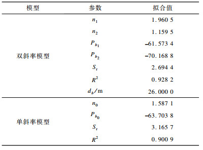 3.2 拟合效果评价指标为说明单斜率模型和双斜率模型对测量数据的拟合效果, 采用回归剩余标准差和相关系数作为评价指标。回归剩余标准差给出了测量值与拟合值的平均偏差, 其值越接近0表明拟合效果越好。回归剩余标准差的定义为: