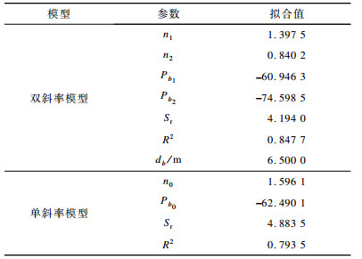 本文首先对操场环境下的测量数据进行处理, 得到单斜率模型和双斜率模型的拟合曲线如图 4所示, 计算得到的模型参数如表 1所示。从图 4可以看出, 拟合曲线与测量数据之间存在较好的拟合关系, 这从表 1中的评价指标也可得到验证。双斜率模型的回归剩余标准差Sr要小于单斜率模型, 并且相关系数R2更接近1。因此, 对完全开放的室外操场环境而言, 双斜率模型较单斜率模型有更好的拟合效果, 这与文献[2-3]的结论一致。