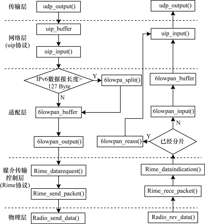 由于IPv6链路的MTU为1 280 Byte, 而ZigBee允许的MTU为127 Byte, 除去MAC头部和标识等其他信息, 实际负载仅剩81 Byte, 因此必须对IPv6数据包进行分片和重组。分片的过程为:通过适配层检测一个经头部压缩的IPv6数据包长度是否大于127 Byte, 若大于则调用6lowpan_split()函数进行分片, 否则直接将其传输给媒介传输控制层的Rime来处理。重组的过程为:由适配层来检测从媒介传输控制层发来的数据包是否已经分片, 若已分片则将其存储到一个缓冲区队列中, 待所有分片到达后调用6lowpan_reass()函数进行重组, 最后发给网络层的uIP处理。图 1所示为分片、重组过程。