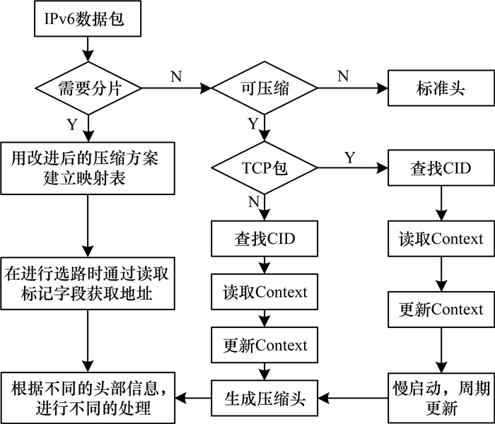 由于IPv6报头长度为40 Byte, 加上用户数据包协议(User Datagram Protocol, UDP)报头的8 Byte, 报头较长势必会降低有效负载和传输效率, 因此必须进行报头压缩。RFC4944定义的HC1和HC2无状态报头压缩方案仅适用于单播链路本地地址[18], 而IPHC[19]虽然适合全局地址, 但是经该方案压缩后的分片头部依然存在大量冗余, 在数据传输中会增加节点的能量消耗。