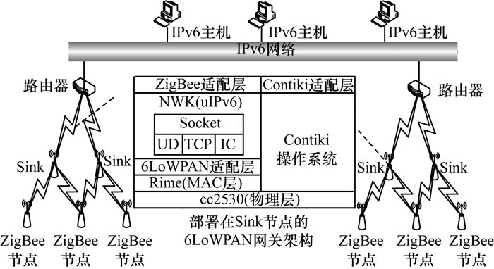 由于IP的无线传感器网络比其他使用特定协议的异构网络更易于实现数据交互, 互联网关使得感知节点和互联网主机之间形成端到端的通信。本文所设计的6LoWPAN网关依托Contiki操作系统, 集成uIPv6和Rime 2种协议栈, 网关与IPv6主机以及感知节点之间的通信如图 3所示。PC机和网关都通过网线连接到支持IPv6的路由器上, 其中, 6LoWPAN网关架构部署在Sink节点上, ZigBee节点仍具有自组网特性。在实际组网过程中, 网关负责接收和处理来自ZigBee网络和IPv6网络的数据, 为每个节点分配IPv6地址, PC机通过DHCPv6自动获取IPv6地址。