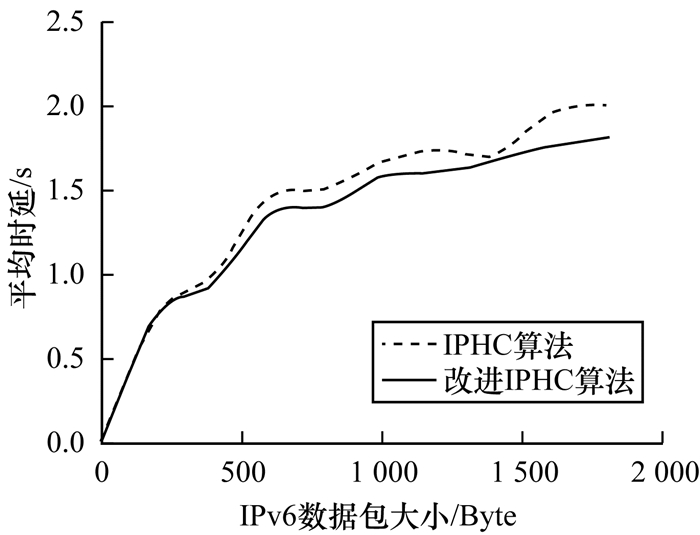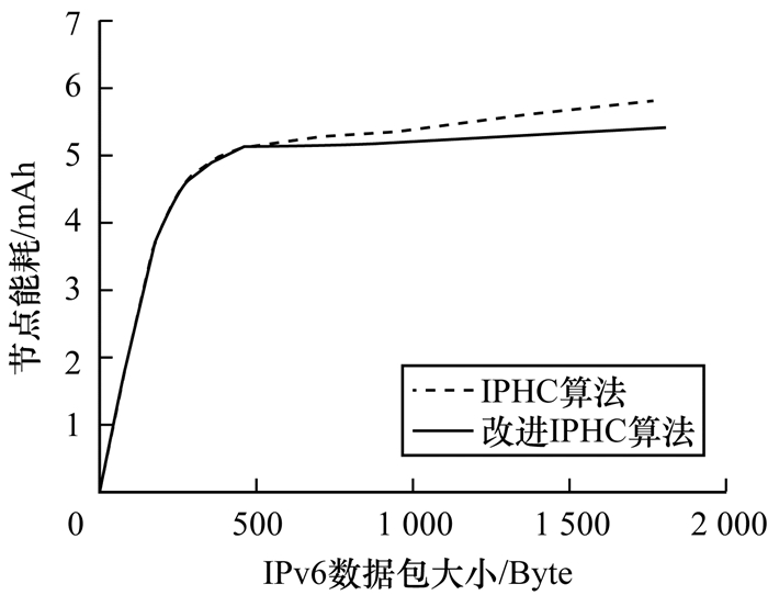图 4所示为压缩算法改进前后的节点功耗对比。由图 4可知, 改进后的算法在处理超过400 Byte的数据包时, 其能耗开始低于改进前的IPHC算法。这是因为降低分片冗余之后, 每个分片的负载更多, 总的分片个数减少, 所以改进后的方案在处理大数据包时效果更优。