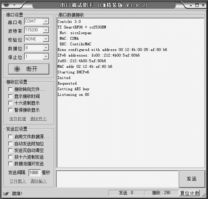 本文搭建的测试环境包含一台支持IPv6的路由器、一台PC机、一个网关节点和若干个ZigBee节点, 其中, 网关节点中搭载了本文所设计的嵌入式网关架构。令各节点组建局域网, PC通过串口连接网关, 如图 6所示。利用串口助手读字符串, 依次打印出Contiki版本号、开发板型号、rime地址、网关的链路本地地址、监听端口号等, 验证Contiki及其协议栈到cc2530硬件平台能够成功移植。