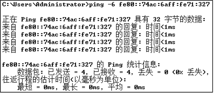 搭建环境之后, 利用ping命令对网关节点进行测试, 在一台支持IPv6的PC上打开命令行窗口, 利用ping命令测试本文架构的连通性, 在测试中, 把6LoWPAN网关节点的IPv6地址设置为:fe80::74ac:6aff:fe71:327, PC的IPv6地址前缀和6LoWPAN网关节点保持一致, 测试结果如图 7所示。根据返回的IPv6数据包进行参数分析, 证明6LoWPAN网关节点已处于IPv6网络中。