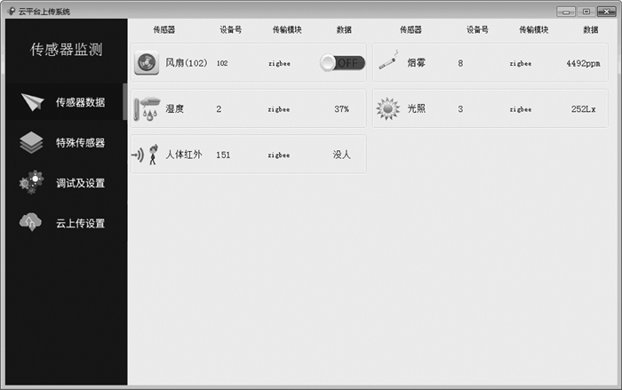 利用本文网关设计环境监控系统, 实现对ZigBee传感器温湿度、烟雾、红外、风扇的监控。图 8为在实际室内环境下, 通过IPv6网络内的PC终端采集到的ZigBee传感器数据, 其结果验证了本文方案的可行性。