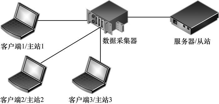 2 Modbus/TCP协议结构Modbus/TCP应用数据单元(Application Data Unit, ADU)的结构如图 1所示。其中, Trans指的是transaction, 即连接序号数, Protocol恒定为0x0000, Length表示从Unit开始的消息长度, 即字节数, Unit恒定为0xff, F-Code表示Function Code, 即指示该消息性质的识别码, Parameters是该条消息的具体参数(1≤x≤252)。整个消息的最大字节数是260, 从Trans到Unit的7 Byte被称为Modbus消息头(Modbus Application Header, MBAP), 余下的最多253 Byte被称为Modbus数据单元(Protocol Data Unit, PDU)。Modbus/TCP的通信结构由主站和从站构成, 前者可类比于发出指令的客户端, 后者可类比于服务端, 主站可能与从站有多个待处理事务, 而一个从站可能与多个主站进行通信, 如图 2所示。