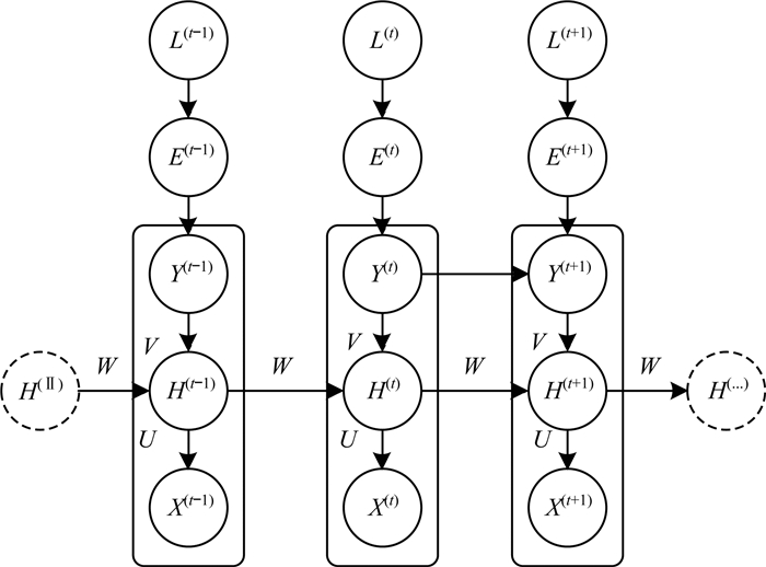 3.1 RNN学习模型适用性解析RNN是一种在输入序列X={X(1), X(2), …, X(T)}上工作, 拥有隐藏状态H={H(1), H(2), …, H(T)}和输出Y={Y(1), Y(2), …, Y(T)}的神经网络, 其能将从序列X到序列Y的映射储存在网络中, 如图 4所示。换言之, 该模型学习到的是条件概率Pr ((Y(1), Y(2), …, Y(T))|(X(1), X(2), …, X(T))), 当输入测试值x′时, 可预测出对应的输出y′。在图 4中, U和W为映射参数, L表示期望输出, E表示实际输出Y与L的误差, 每一轮训练的目标是降低E值。
