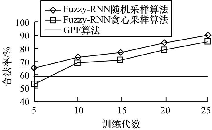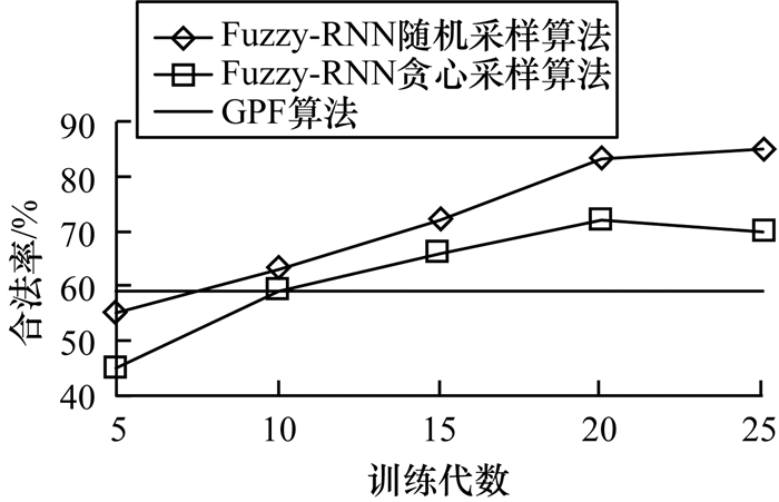 从4个实验整体来看, 合法性指标上都有GPF < Fuzzy-RNN(随机)≈Fuzzy-RNN(贪心)。Fuzzy-RNN算法在训练超过10代之后, 合法率将明显超越GPF算法, 其合法率上升趋势在15代以后显著放缓。GPF算法的合法率平均数为58.5%, 而Fuzzy-RNN算法最终到达的合法率在75%~90%。Fuzzy-RNN算法的贪心采样在pymodbus上最终合法率明显低于其他3组, 随机采样在训练代数小于20时, 其合法率也出现该现象。其原因在于该仿真软件支持的数据模式与参数范围有限, 增加了随机生成中正常抛出的可能性。对于15代~25代的Fuzzy-RNN算法, 贪心采样的平均合法率比随机采样高3.92%。由于Modbus协议的参数取值空间较大, 随机采样造成的合法性下降对其影响不大, 从侧面说明了学习模块的概率密度模型适用于针对该协议的预测。