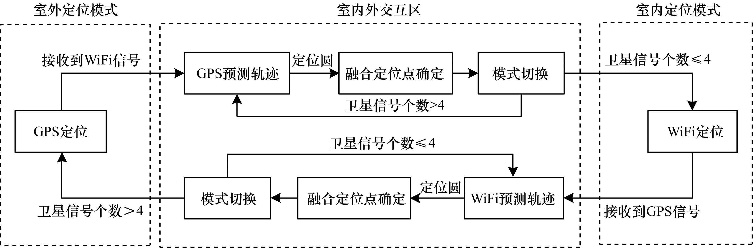 2 室内外融合定位方法在定位过程中, 当用户只接收到GPS信号而无WiFi信号时, 用户在室外采用GPS定位方式; 当用户只接收到WiFi信号而无GPS信号时, 用户在室内采用WiFi定位方式; 当用户同时接收到GPS信号和WiFi信号时, 则定义用户在室内外交织区。