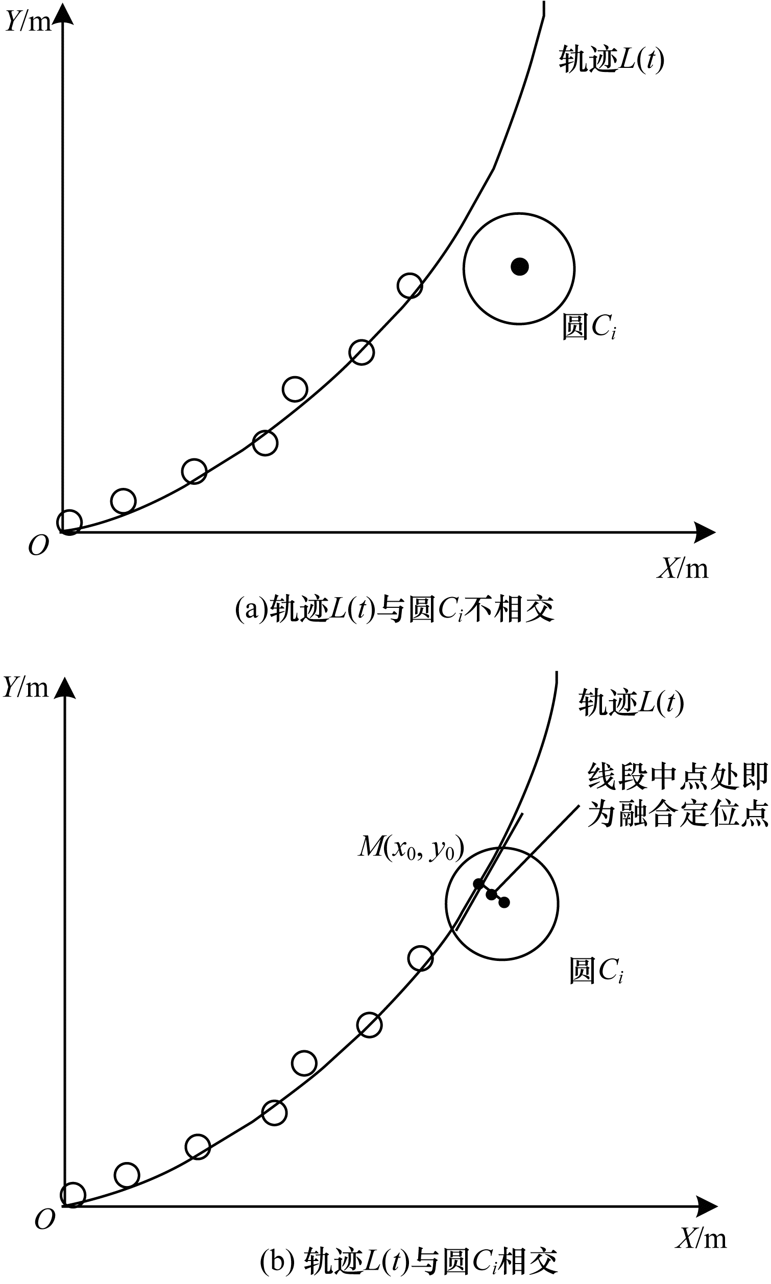 2.2 融合定位点确定融合定位点即室外GPS与室内WiFi定位结果经融合后计算得到的当前位置坐标, 由灰色预测轨迹L(t)与定位圆Ci的位置关系来确定, 如图 2所示。在图 2(a)中, 灰色预测轨迹L(t)与圆Ci不相交, GPS定位与WiFi定位中至少有一种方式误差较大, 融合定位失败。在图 2(b)中, 轨迹L(t)与圆Ci相交, 融合定位点为M(x0, y0)与(xi, yi)所连线段的中点, 其中M(x0, y0)为轨迹与定位圆距离最近的点。