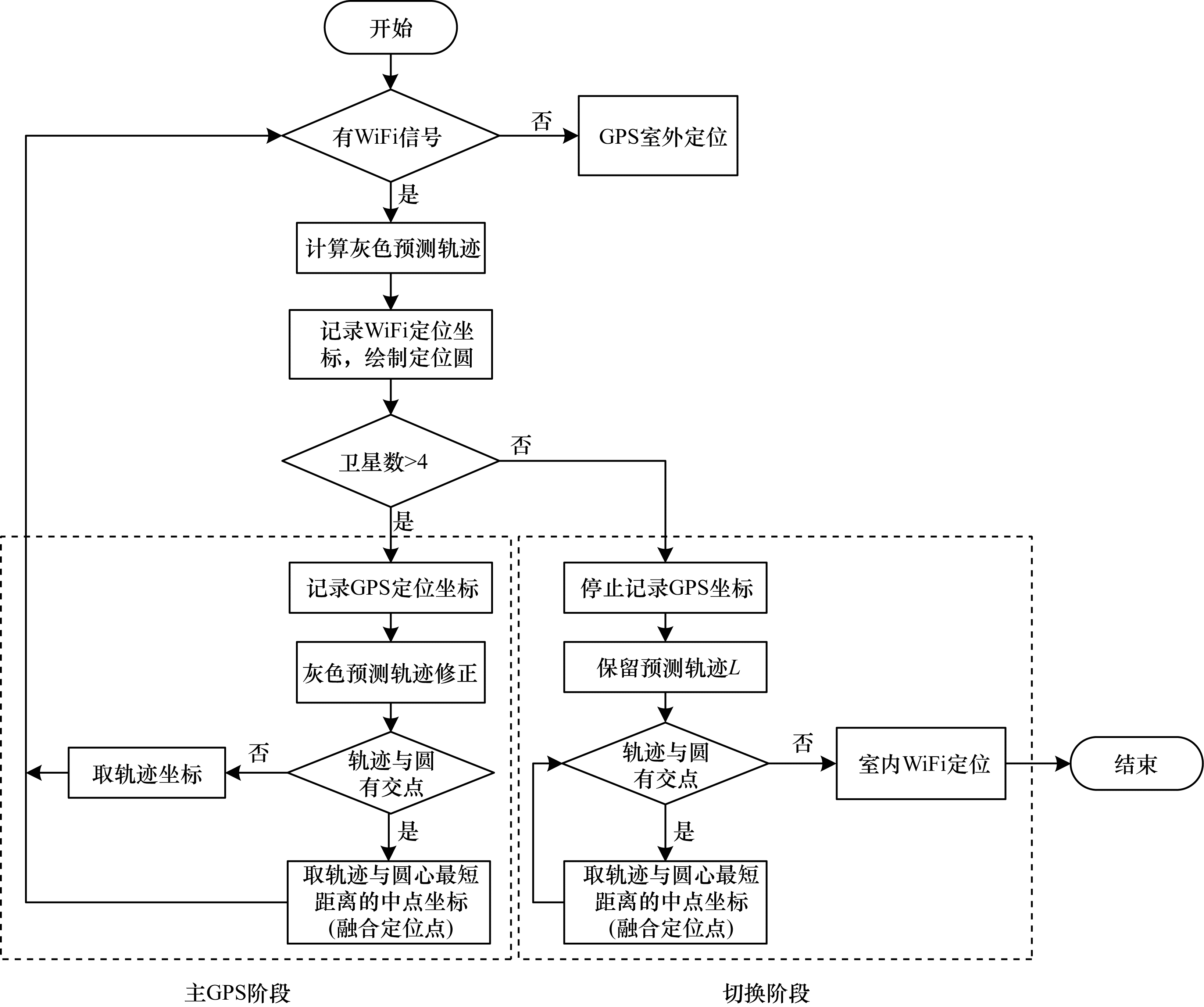 在融合定位失败后, 需参考GPS接收信号数切换定位模式。当信号数小于等于4时, GPS预测轨迹的精度较低, 切换为室内定位模式, 此时基于灰色预测模型的融合定位结束; 当卫星信号数大于4时, 视GPS获取的数据为可靠GPS数据, 定位点取GPS预测轨迹坐标, 并继续计算修正GPS预测轨迹, 与WiFi定位点进行融合定位。室外进入室内的融合定位方法流程如图 3所示。从室内到室外的融合定位方法与之相反, 即WiFi预测轨迹与GPS定位点融合, 根据最新的WiFi定位数据修正预测轨迹。