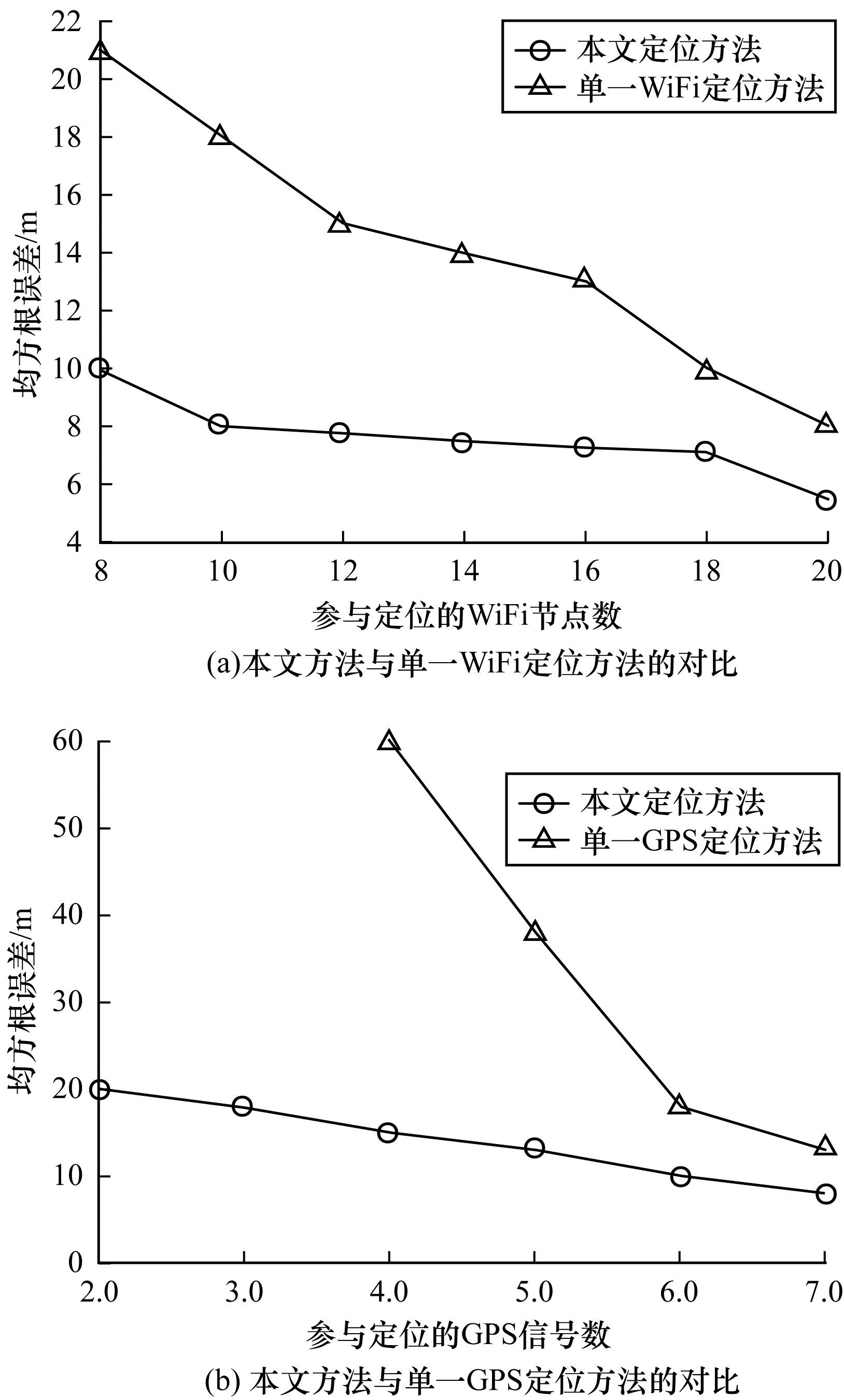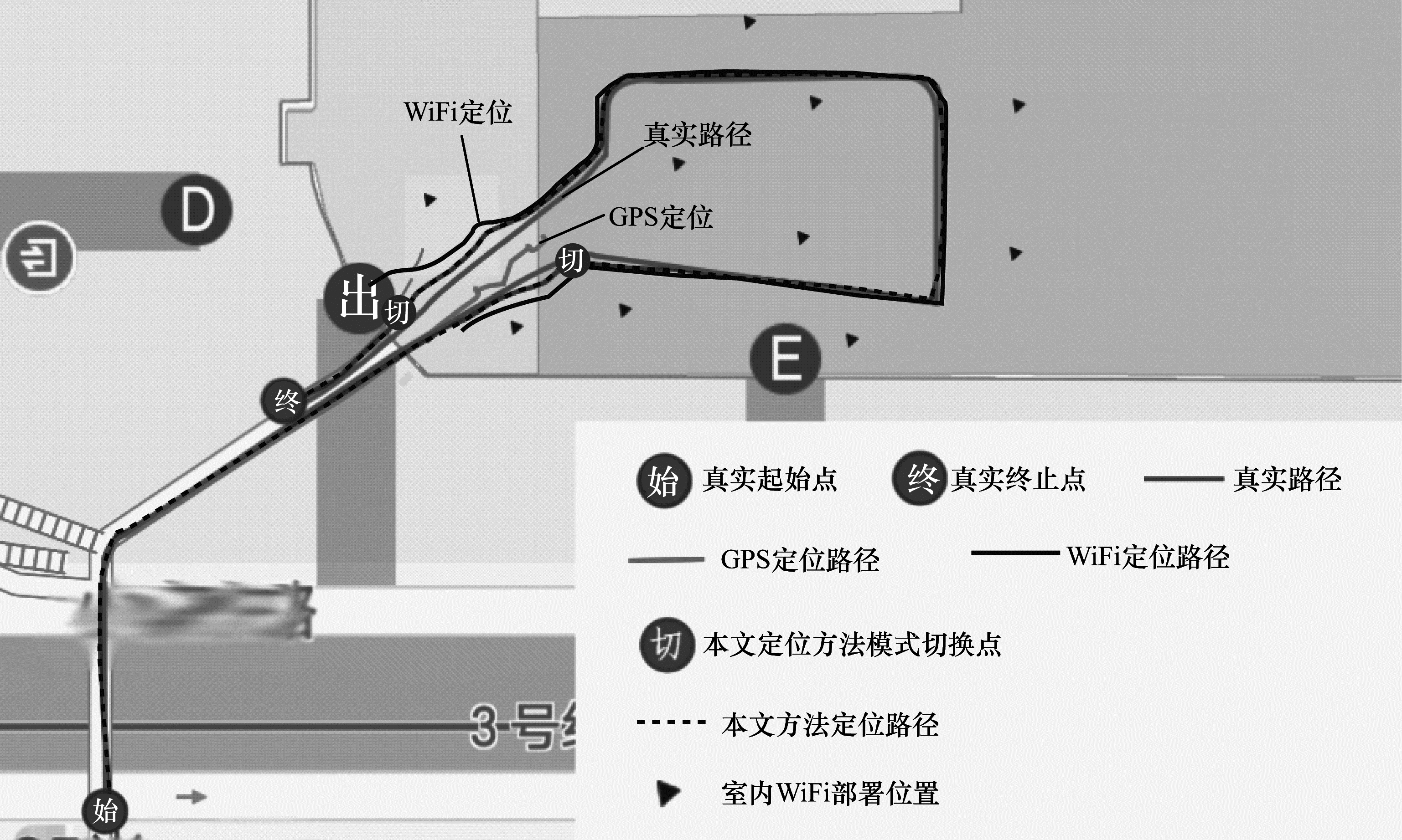 实验结果表明, 与传统单一的GPS、WiFi定位方法相比, 本文方法的定位精度较高, 适用范围扩大, 能有效实现室内外信号交织区域定位的平滑过渡以及自动模式切换, 具有较高的可行性与鲁棒性。