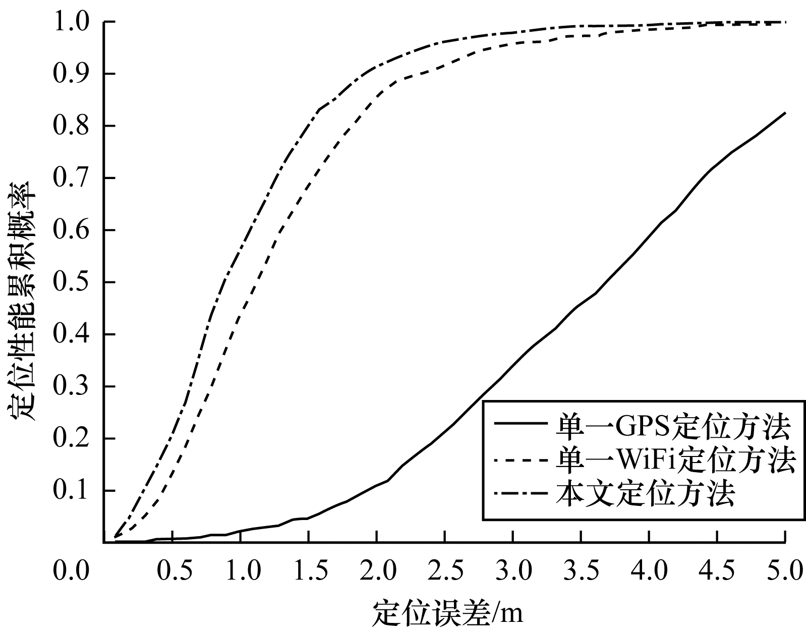 由图 5可知, 本文方法在概率小于0.55时的定位误差小于1 m, 在概率小于0.95时的定位误差低于2.5 m; 基于WiFi的定位方法在概率为0.43时的定位误差为1 m, 在概率小于0.95时的定位误差小于3.2 m; 基于GPS的定位方法在概率小于0.58时的定位误差小于4 m, 在概率为0.82时的定位误差达到5 m。因此, 在室内外交互区域, 本文定位方法的定位精度比单一WiFi定位与单一GPS定位高。