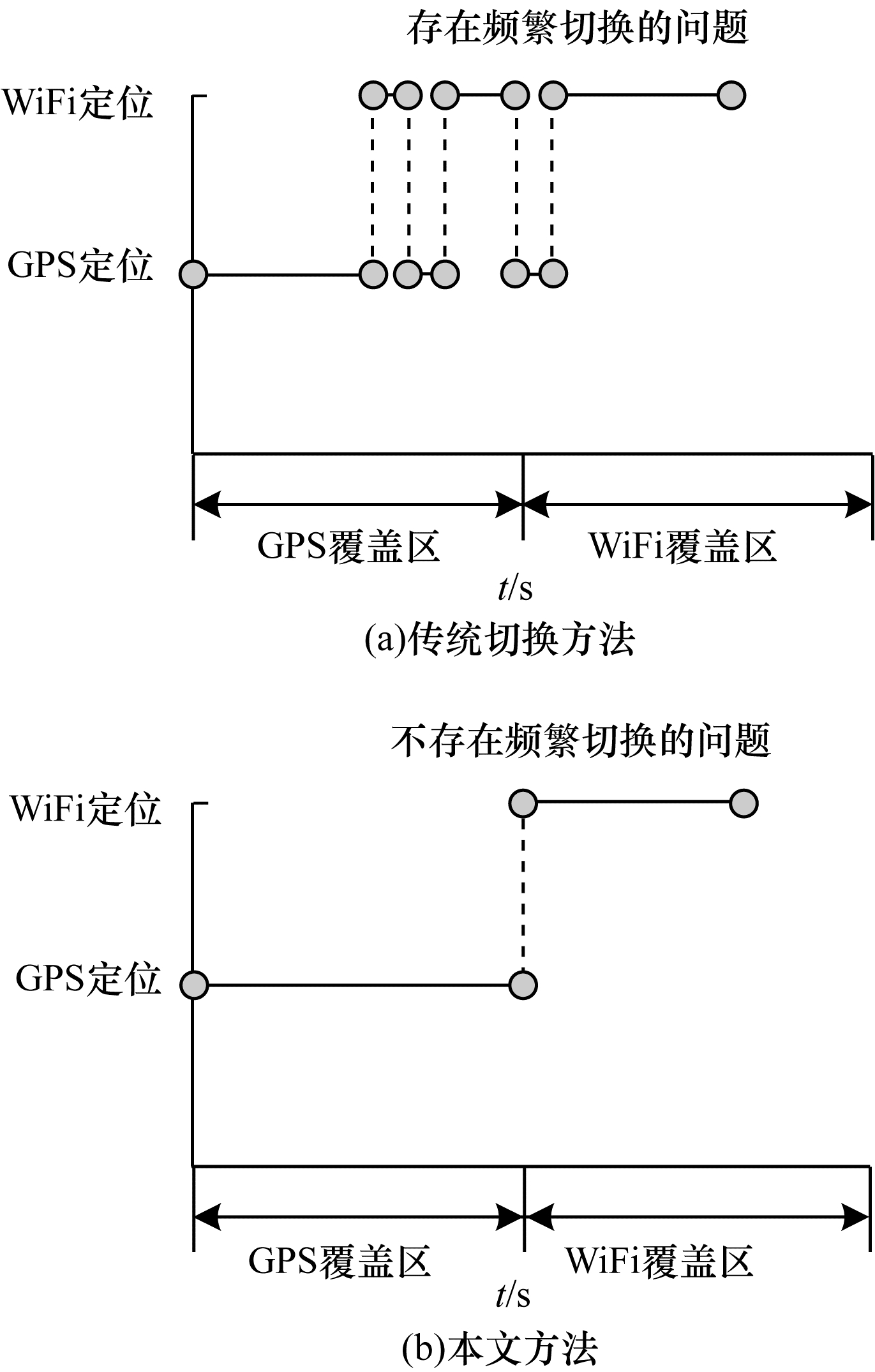 现有的无缝定位方法多采用室内/室外组合定位的方式, 主要包括GPS/蓝牙[1]、GPS/地磁[2]、GPS/蓝牙/惯性导航[3]、GPS/基站[4]、GPS/RFID/Video[5]、GPS/UWB[6]以及GPS/WiFi[7]。近年来, WiFi技术得到大力推广, 基于WiFi的室内定位技术日趋完善[8-9], GPS/WiFi的组合定位方式更适合普通环境下的无缝定位。文献[10]提出一种可有效缩短GPS/WiFi定位系统位置估算时间的算法, 为实现GPS/WiFi高效组合定位系统提供了可能。国内外学者在模式选择切换与定位精度提高方面做了大量研究, 文献[11]分别计算GPS和WiFi定位点的精度, 利用精度阈值判断并选择具有较高精度的定位模式。文献[12]使用Alpha-Count机制, 提出一种基于计数与阈值的定位模式切换方法。文献[13]利用用户历史位置信息, 提出一种基于k平均算法的异常值补偿方法, 提高系统定位精度。文献[14-15]利用MARG (Magnetic, Angular Rate and Gravity)分别增加GPS和WiFi系统的定位精度。上述方法只能进行定位系统的直接切换, 不能充分融合室内外的定位优势, 实现定位模式的平滑过渡。加权策略和自适应滤波是2种常用的融合定位方法, 这些方法将系统不同模式下的定位信息融合为一个相对精准的定位点[16]。加权策略的权值需根据环境因素即时更改, 其误差较大且用户体验差。自适应滤波法常用的有卡尔曼滤波(Kalman Filtering, KF), 以及其延伸出的无迹卡尔曼滤波(Unscented Kalman Filter, UKF)、扩展卡尔曼滤波(Extended Kalman Filtering, EKF)、容积卡尔曼滤波(Cubage Kalman Filtering, CKF)[17], 这些方法多应用于线性系统融合滤波。对于任意概率分布的样本数据采用粒子滤波法(Particle Filter, PF)[18], 该方法需要采集大量样本数据, 且滤波融合方法多与惯性导航系统结合[19]。移动设备自带的惯性传感器精度较低且抗干扰能力差[20], 计算复杂并具有一定的局限性。文献[21-22]提出一种综合性的定位方法, 根据接收GPS信号的个数与GPS/WiFi的可用情况将定位分为4种模式, 每种模式采用不同的定位方案, 利用自适应滤波和最小二乘法得到不同的定位方案, 但这种仅凭信号个数选择定位模式的方法存在反复切换的缺点[23]。