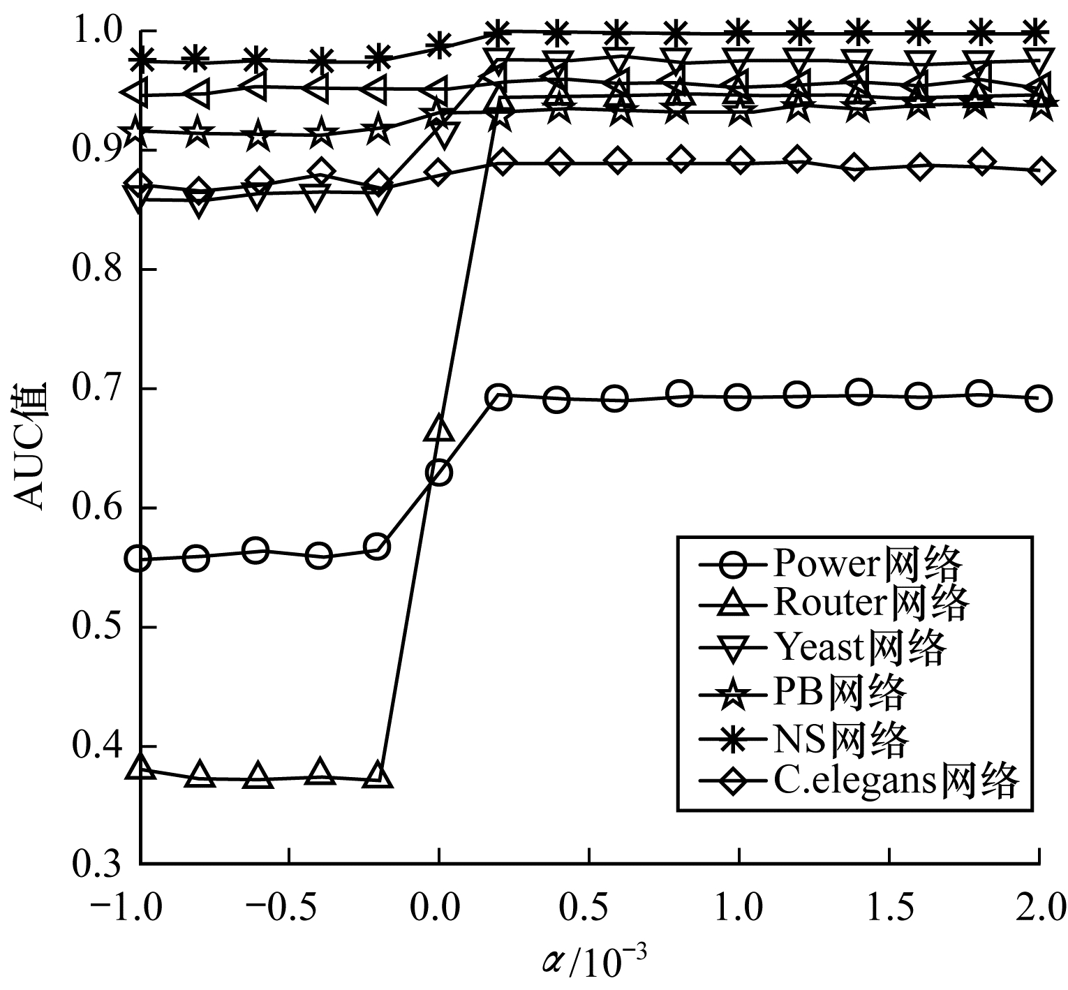 图 1 LRPA算法α参数取值与预测AUC的关系 |