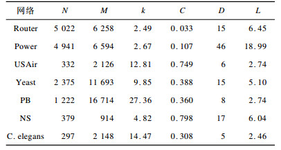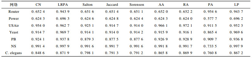 4.1 算法参数选取与预测性能比较本文采用7个测试数据集[5]:Router为Internet中路由器层次的网络, Power为美国西部电网, USAir为美国航空网络, Yeast为蛋白质相互作用网络, PB为美国某政治论坛博客网络, NS为发表过复杂网络为主题的科学家合作网络, C.elegans为线虫的神经网络。数据集的网络基本统计特征详见表 1。其中, N为网络的节点数量, C为网络聚类系数, M为网络的边数量, D为网络的直径, k为网络的平均度, L为平均最短路径。