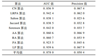 其中, n为独立比较的次数, n′为测试集中边得分值优于不存在的边得分值的情况次数, n″表示测试集中边得分值等于不存在的边的得分值的情况次数。