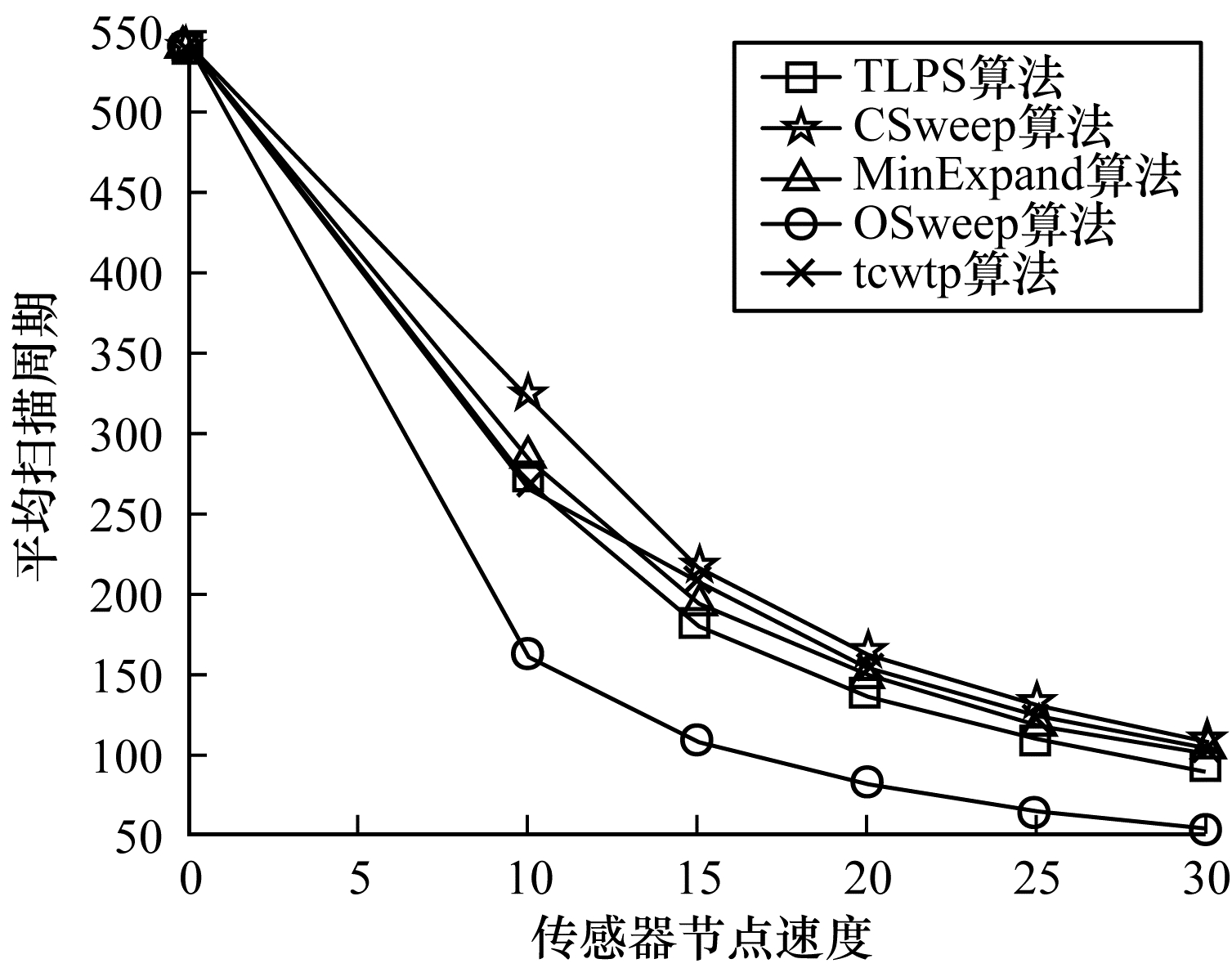在所有POI位置和权重相同的条件下, 5种对比算法在移动传感器节点速度不同时的平均扫描周期对比如图 1所示。其中, POI数量设定为100, 最小权重值设置为1, 高权重的节点数量为当前权重节点数量的10%, 传感器节点的移动速度为唯一变量, 由0逐步增加到30。从图 1可以看出, 随着移动传感器节点速度的增加, 所有算法的平均扫描周期均下降。由于OSweep算法不对路径进行分割, 所有节点均在原路径上运动, 路径的利用率最高, 因此其扫描周期相对于其他算法最短。相较于CSweep、MinExpand和tcwtp算法, 本文TLPS算法平均扫描周期更短, 原因是本文算法在对初始路径进行分割时充分考虑了单个传感器节点的最大路径代价。TLPS算法的平均扫描周期更短, 因此, 在移动传感器节点速度相同的情况下, 每个传感器在扫描周期内移动的距离也更短, 即每个移动传感器的能耗更少。
