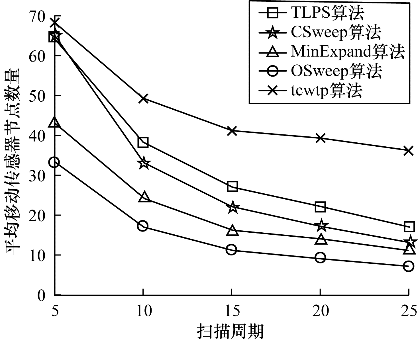 在POI数量固定的情况下, 平均移动传感器节点数量随扫描周期的变化情况如图 2所示。其中, POI数量和权重设定与上一次实验相同, 移动传感器节点移动速度设定为20, 扫描周期为唯一变量, 从5逐步增加到25。从图 2可以看出, 随着扫描周期的增大, 所有算法的传感器节点数量均减少, 这是由于单个传感器节点的移动路径增大, 可以覆盖更多的POI, 因此可以减少部分传感器节点数量。而在扫描周期相同的情况下, TLPS算法相对于不考虑权重节点的覆盖算法而言节点数量较多, 但是相对于tcwtp算法而言节点数量较少。这是由于TLPS算法在部署时对已存在的最短路径进行分割, 分割时尽可能选择权重节点位置, 这样会降低路径的代价, 间接减少移动传感器的数量, 此外, 相对于不考虑权重节点的覆盖算法而言节点数量较多是由于其覆盖了较多权重更高的POI, 相对于其他算法, 本文算法的权重节点有效覆盖率更高。