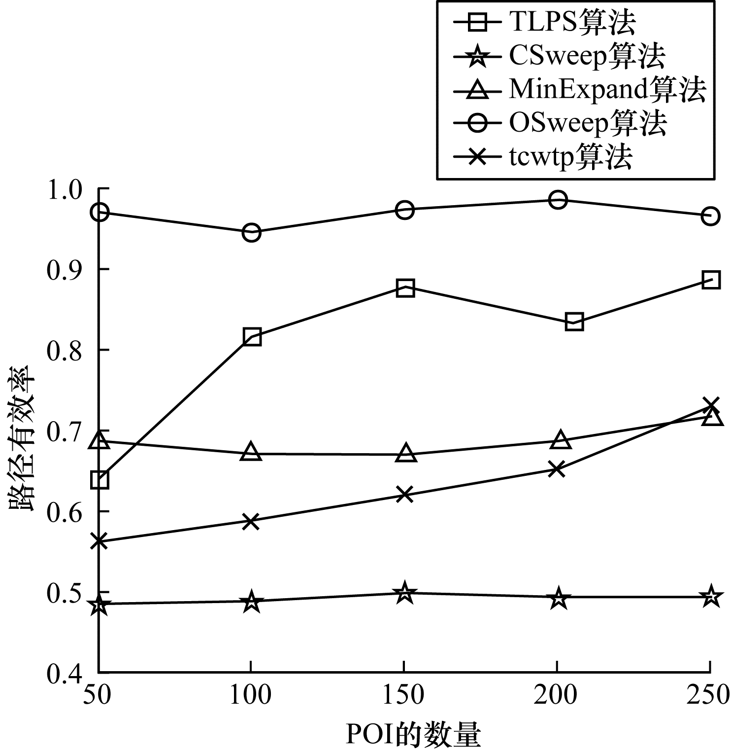 对比分析5种算法部署传感器后的路径有效率, 在本次实验中, POI的数量为唯一变量, 从50逐步增加到250, 高权重节点数量占当前权重节点数量的10%, 移动传感器的速度设定为20, 扫描周期设定为15。从图 3和表 1可以看出, OSweep算法的路径有效率最高, 这是由于其所有的移动传感器均在一条路径上移动, 多余路径最少。而TLPS算法的路径有效率相对其他3种算法更高, 这是由于该算法在分割每条路径时参考当前路径长度和单个传感器最大路径之间的关系, 尽可能在每次分割时都保证路径有效率相对更高。同时随着POI数量的增加, TLPS算法依然能保持较高的路径有效率, 间接降低了节点部署的代价。