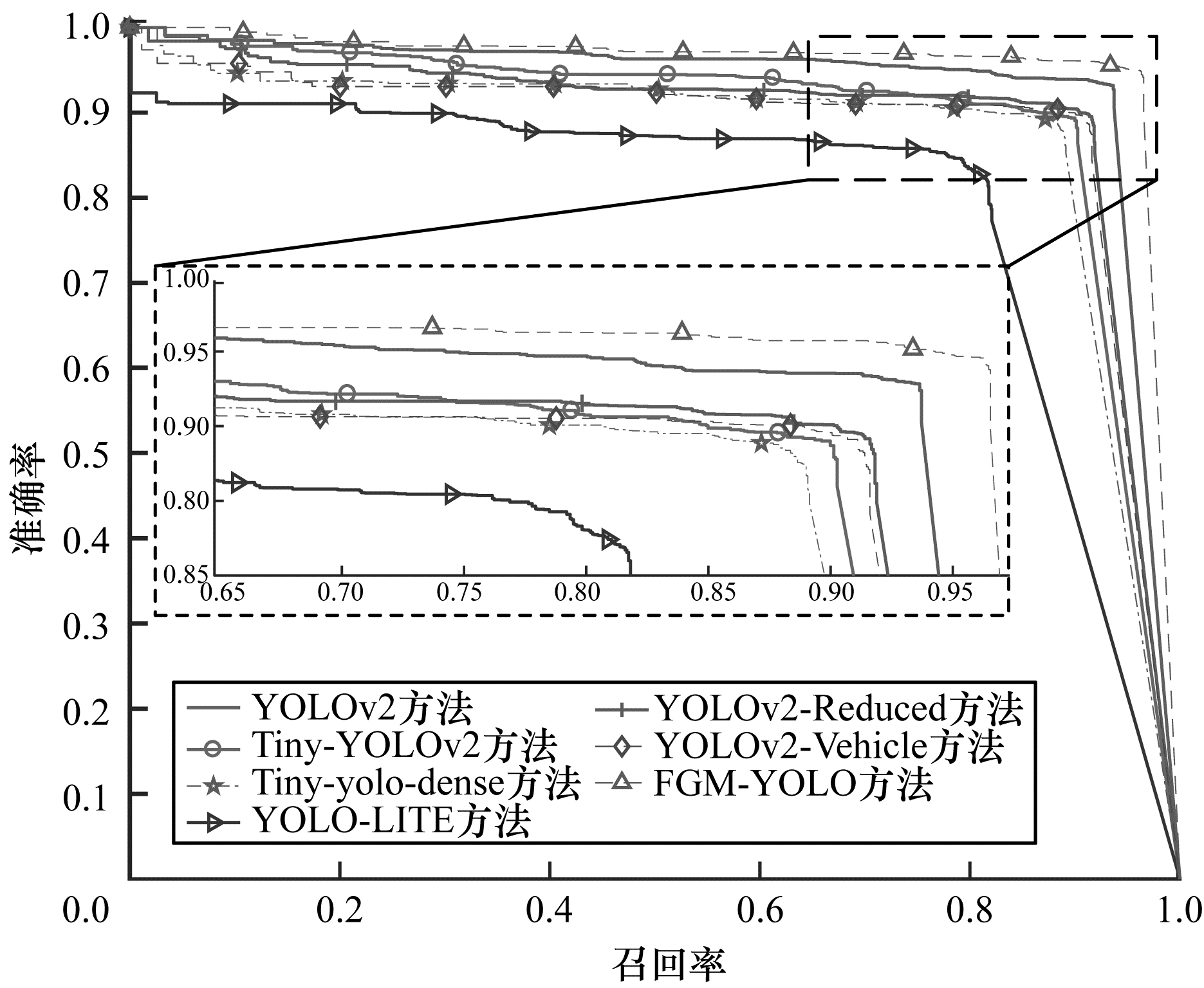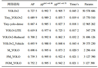本文方法FGM_YOLO与YOLOv2、Tiny_YOLOv2及Tiny-yolo-dense、YOLO-LITE、YOLOv2-Reduced、YOLOv2_Vehicle在IoU阈值为0.75时的P-R曲线如图 10所示。从图 10可以看出, 本文FGM_YOLO模型的P-R曲线完全包围其他模型, 可知本文方法在IoU=0.75时的AP值最高。
