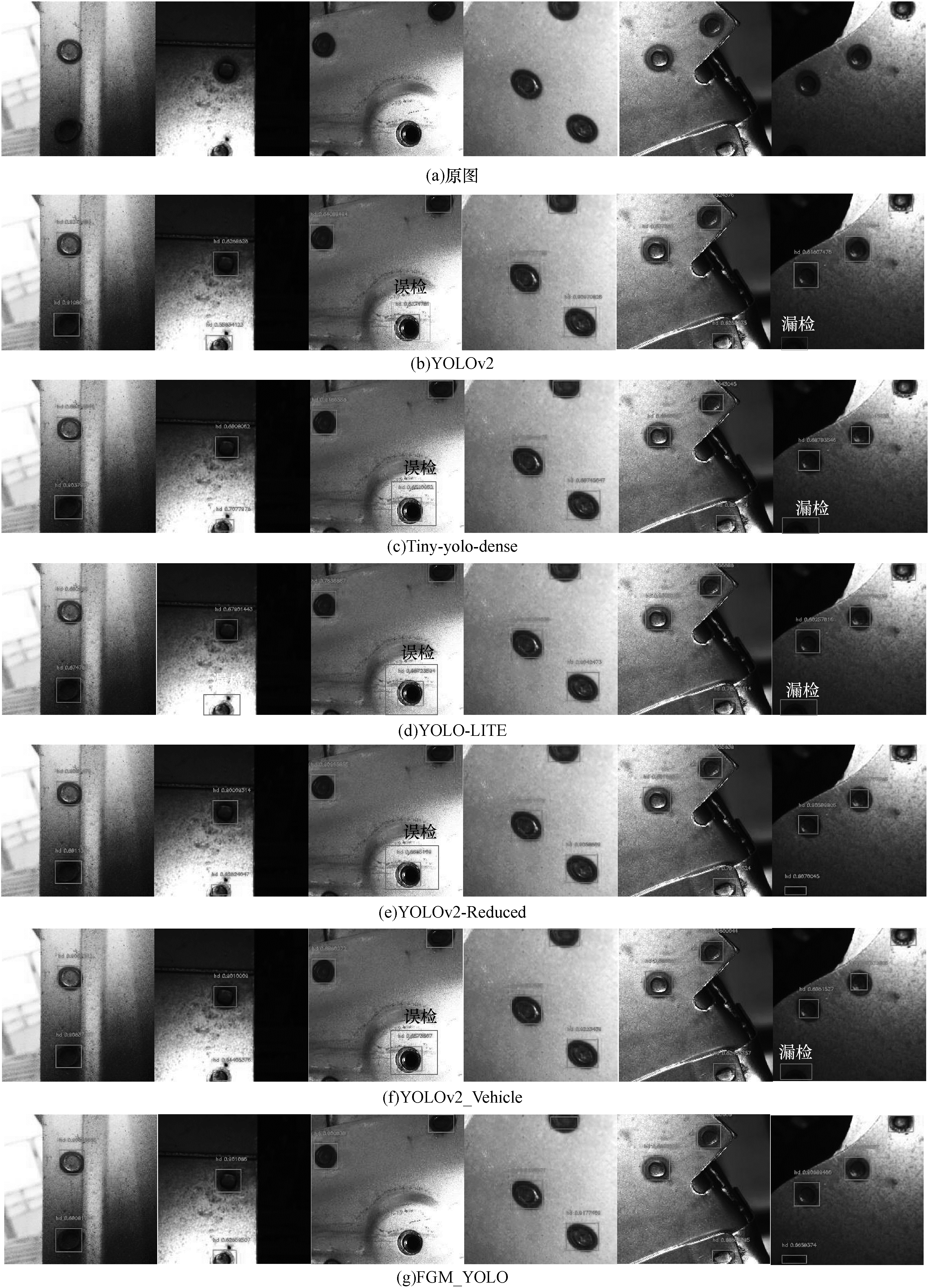 YOLOv2、Tiny-yolo-dense、YOLO-LITE、YOLOv2-Reduced、YOLOv2_Vehicle与本文提出的FGM_YOLO检测结果对比如图 11所示。从图 11可以看出, FGM_YOLO检测结果比YOLOv2、Tiny-yolo-dens、YOLO-LITE、YOLOv2-Reduced、YOLOv2_Vehicle漏检与误检更少。可见本文所提出的检测方法与YOLOv2及其他改进方法相比在焊点检测中有一定的优势。