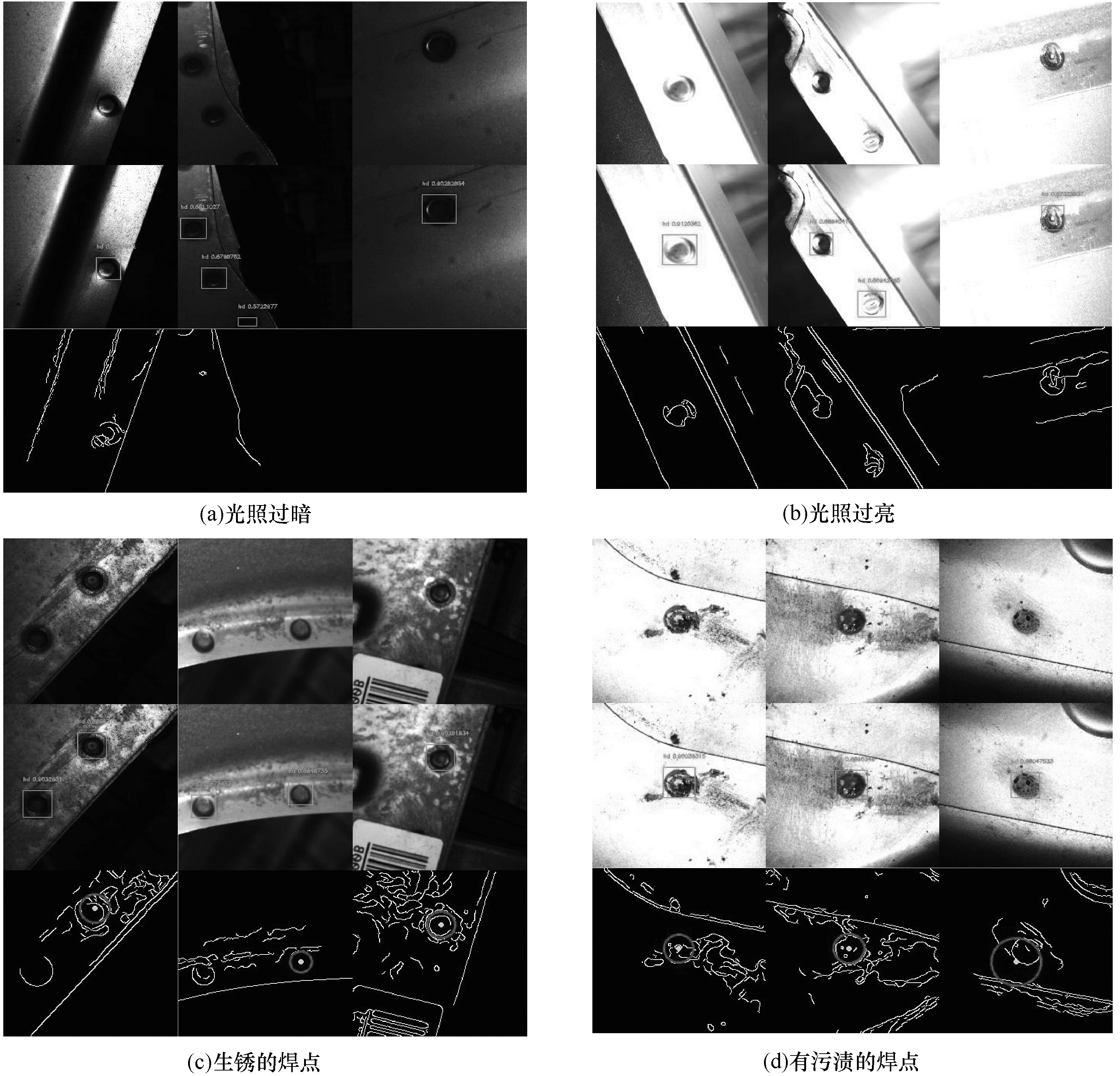 白车身焊点质量对汽车的性能有着重要的影响, 焊点质量检测决定着白车身性能的可靠性。目前大部分的白车身焊点手动检测需要耗费大量的人力资源, 效率低下。采用自动化的检测可以提升焊点检测的效率, 焊点检测系统采用传统图像处理、霍夫圆变换的检测方法[1]受环境的影响较大, 在光照过亮、过暗或者焊点有污渍的情况下检测效果不理想, 且焊点轮廓不是标准的圆形, 增大了霍夫圆变换检测方法的检测难度。