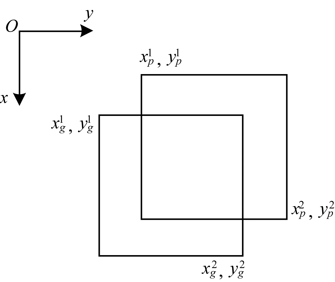 | $ \begin{array}{*{20}{l}} {I = [{\rm{min}}(x_g^2,x_p^2) - {\rm{max}}(x_g^1,x_g^1)] \times }\\ {{\kern 1pt} {\kern 1pt} {\kern 1pt} {\kern 1pt} {\kern 1pt} {\kern 1pt} {\kern 1pt} {\kern 1pt} {\kern 1pt} {\kern 1pt} {\kern 1pt} {\kern 1pt} {\kern 1pt} {\kern 1pt} {\kern 1pt} {\kern 1pt} {\kern 1pt} {\kern 1pt} [{\rm{min}}(y_g^2,y_p^2) - {\rm{max}}(y_g^1,y_g^1)]} \end{array} $ | (2) |