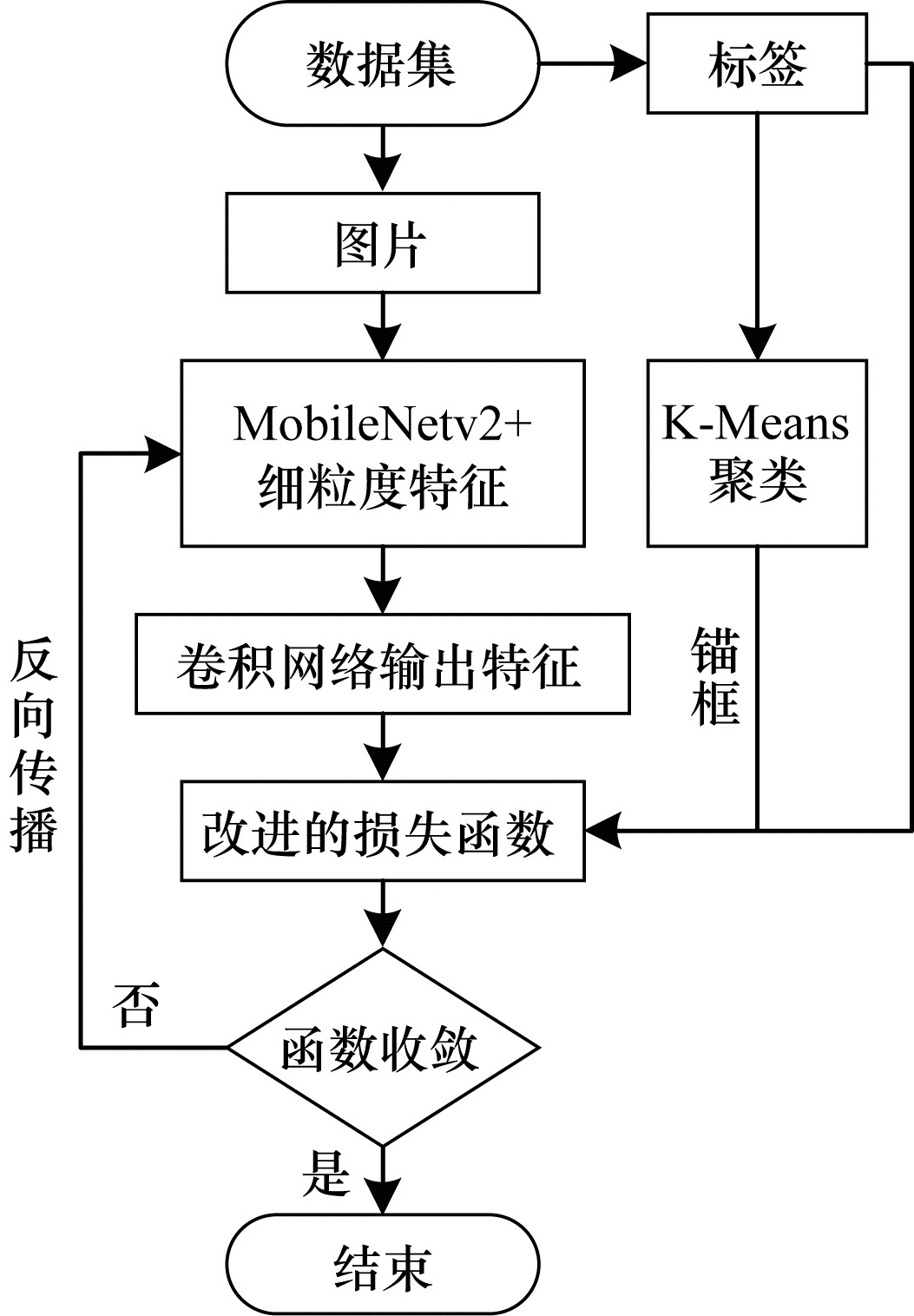 K-means聚类算法中的K代表了聚类的类别数。在K-means聚类时, 设定不同的K值不断优化距离值进行聚类。聚类anchor时距离用聚类损失loss表示, 每个数据与哪个聚类中心的交并比最大即loss最小则归为哪一类, 新的聚类中心为同类anchor长的均值与宽的均值。在聚类时不断优化loss直至loss收敛时聚类结束。交并比(IoU)如式(14)所示, 这里计算交并比时只考虑长和宽, 聚类anchor的损失函数如式(15)所示: