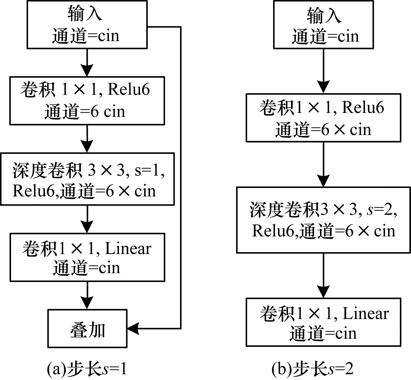 MobileNetv2模型是SANDLER等人提出的第2代轻量级模型, 该模型相比于MobileNet参数更少, MobileNetv2是在ResNet的网络基础上引入了深度可分离卷积并且在残差块上进行了改进。MobileNetv2的卷积块如图 6所示, 卷积块输入特征通道数为cin, 首先经过1×1卷积扩充为输入通道数的6倍, 经过深度卷积之后通过1×1卷积进行通道压缩使通道数与输入通道相同。在残差块的最后一层卷积之后没有采用Relu激活而是采用了Linear激活以防止特征被破坏。当深度卷积的步长s=1时进行shortcut连接, 如图 6(a)所示。深度卷积的步长s=2时不进行shortcut连接, 如图 6(b)所示。