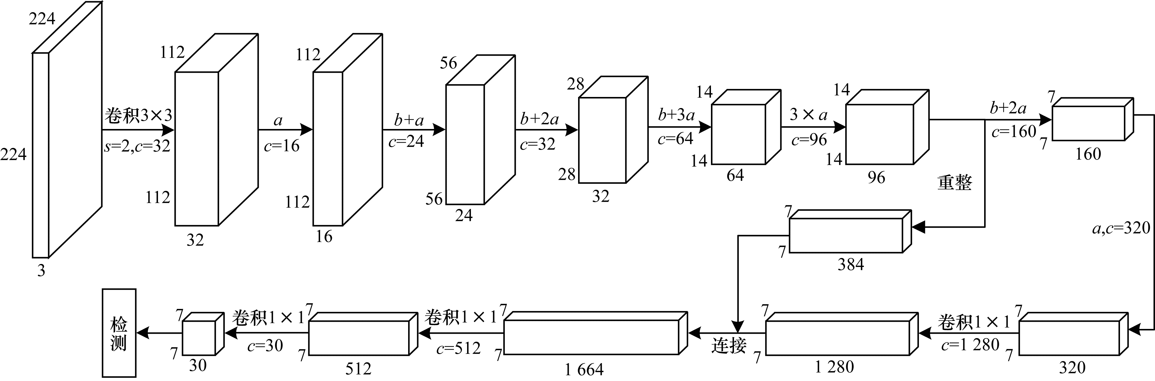 本文用MobileNetv2卷积层代替YOLOv2的darknet19得到了M_YOLO模型。采用细粒度特征方法, 将第12个卷积块的输出特征经过重整操作之后与最后一层的输出特征融合, 然后经过一次卷积操作, 为减少参数, 该层卷积的卷积核大小为1×1。最后连接到检测层得到改进的焊点检测模型FM_YOLO, FM_YOLO模型结构如图 7所示, 其中,a指经过图 6(a)中的卷积块结构操作, b指经过图 6(b)中的卷积块结构操作, c为卷积通道数目, s为卷积步长。