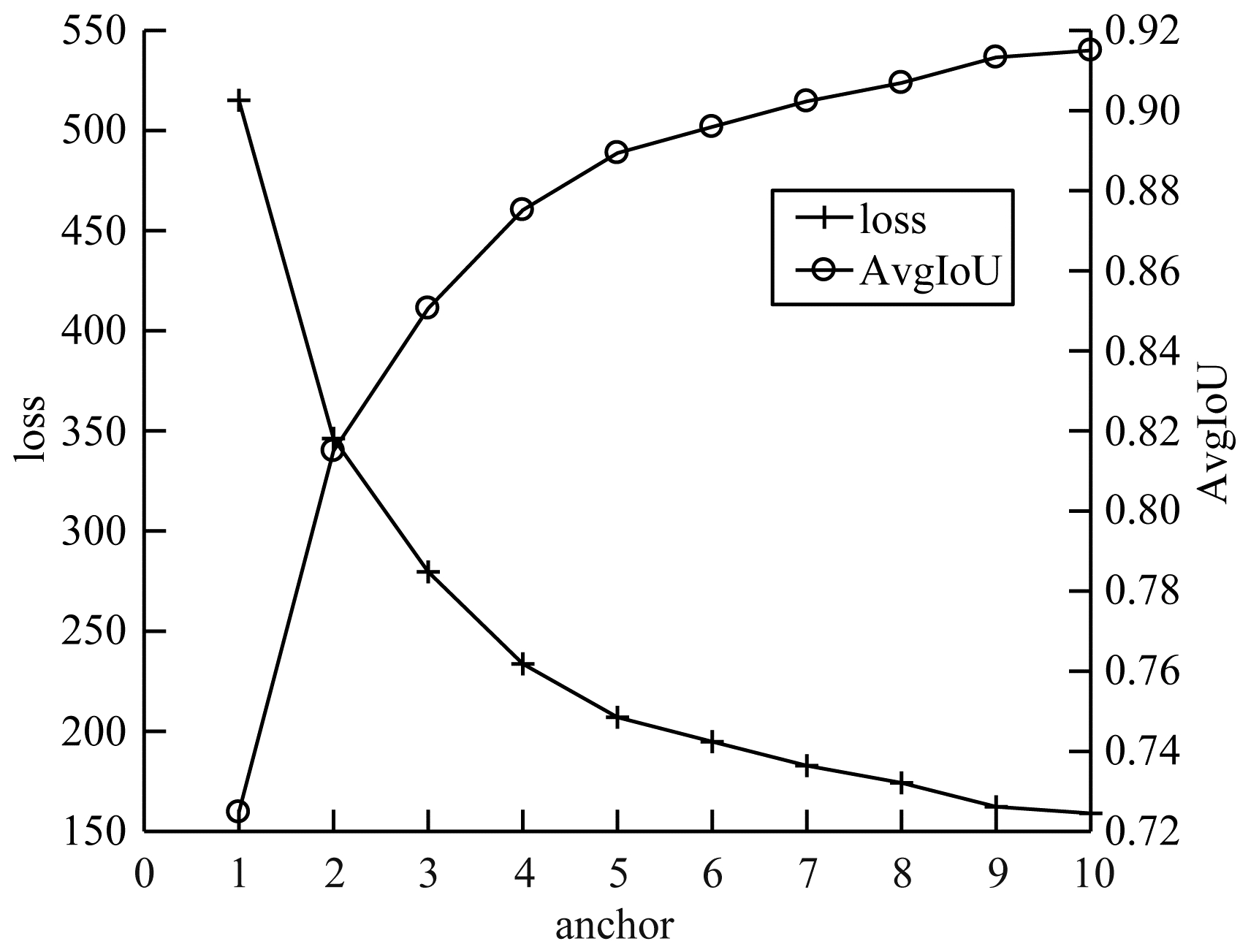本文对制作的白车身焊点数据集, 采用K-means聚类算法进行聚类得到候选区域anchor的数量以及大小。聚类结果如图 8所示, 图 8为聚类损失loss、平均交并比(Average Intersection over Union, AvgIoU)随着anchor数目的变化曲线。