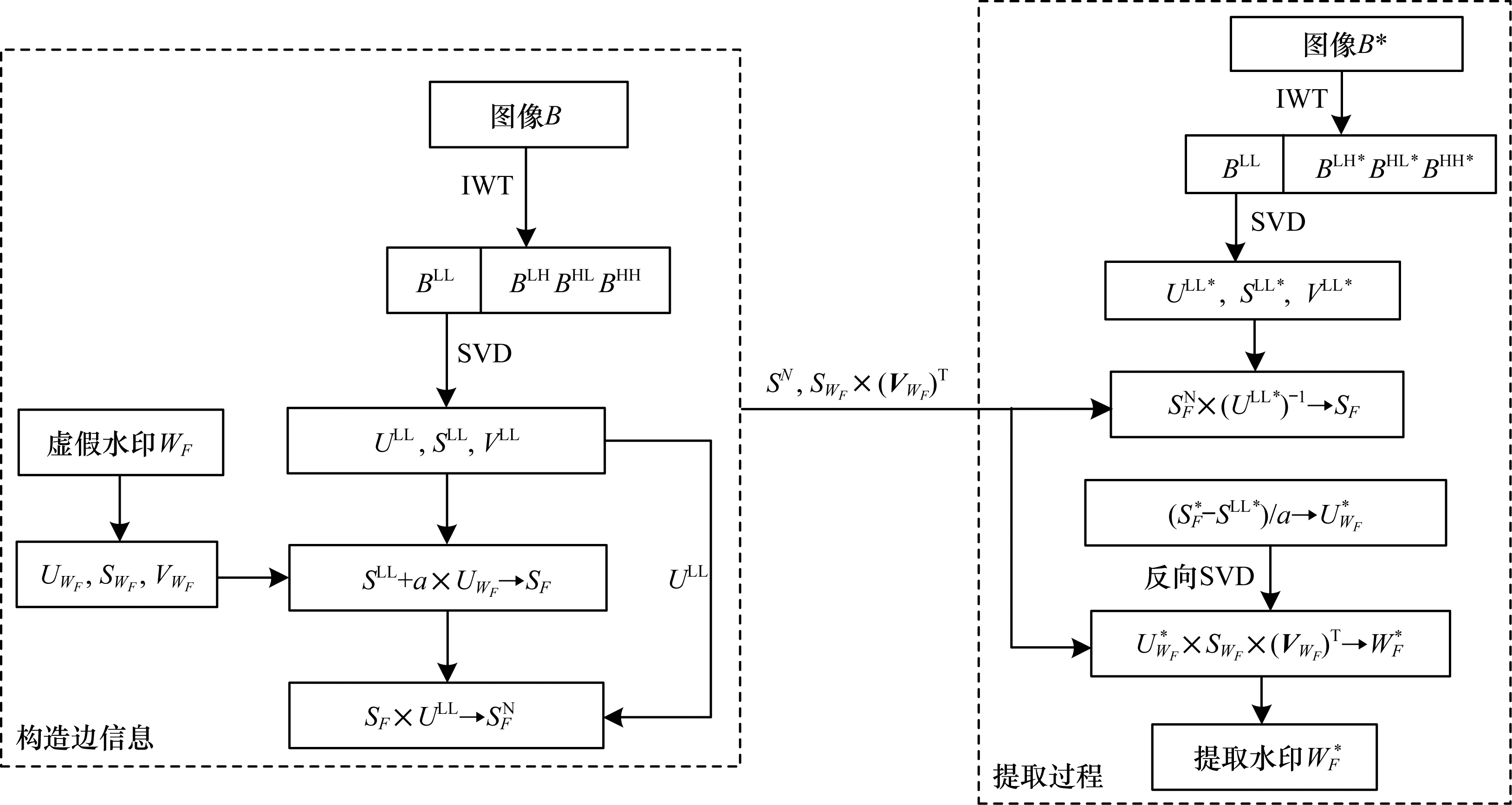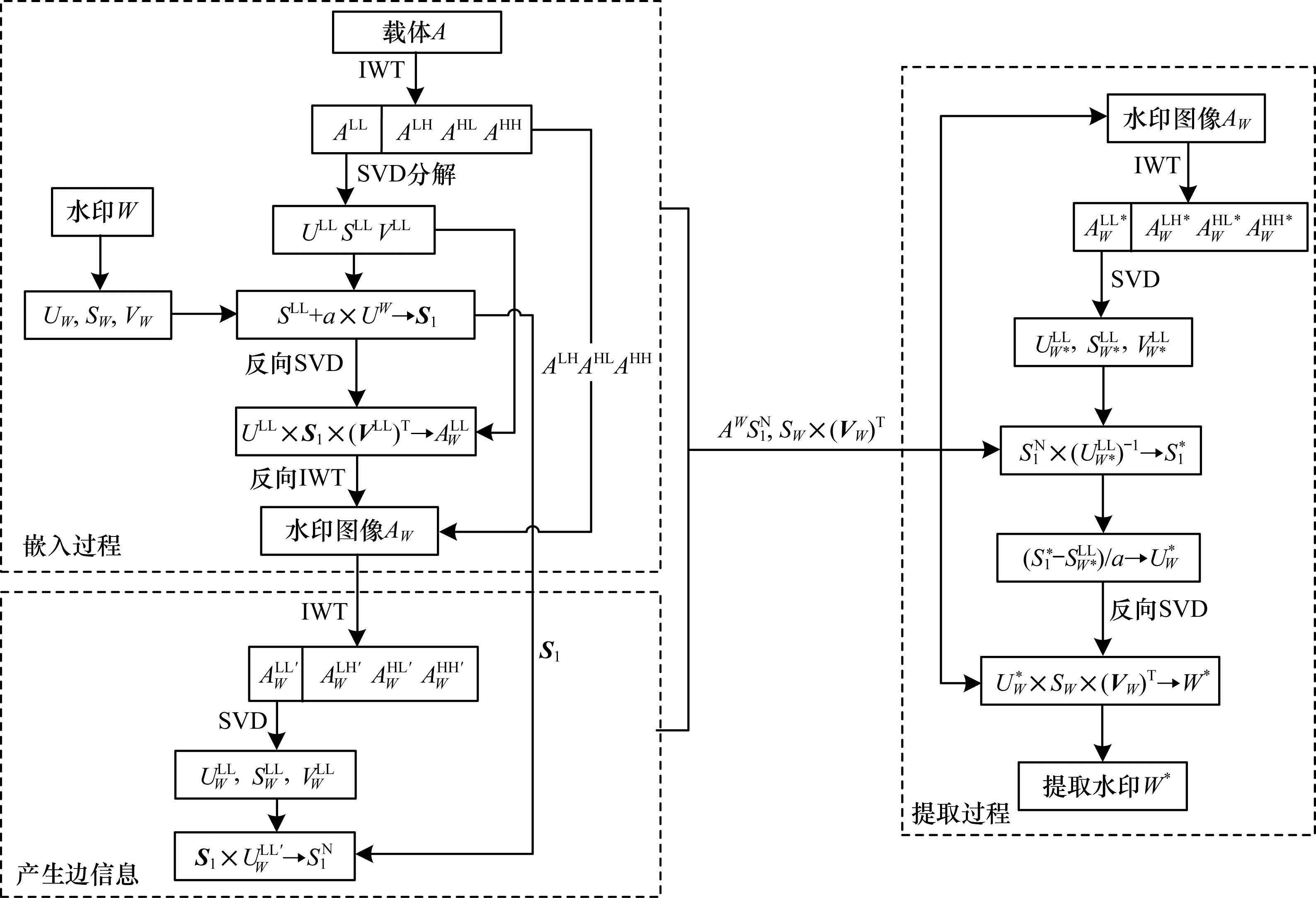 针对上述3类攻击方式, 文献[19]提出一种新的基于奇异值鲁棒性嵌入灰度图水印的方法。与常见同类方法不同, 该方法中水印的左奇异向量与嵌入强度相乘得到的积与载体整数小波变换(IWT)低频域的奇异值相加后的和, 未做SVD而是直接替代载体低频域奇异值得到水印图像, 其嵌入提取流程如图 1所示。在嵌入过程中, 对载体做IWT并对低频子带应用SVD, 同时对水印做SVD。水印的左奇异向量与嵌入强度相乘后, 将得到的积与载体奇异值相加, 得到的矩阵记为S1, S1替代载体奇异值矩阵做反向SVD与反向IWT即可获取水印图像。利用得到的水印图像, 该方法将进一步计算边信息:对水印图像做IWT与低频子带的奇异值分解后, 将得到的左奇异向量与S1相乘获取边信息, 记为S1N。嵌入过程除了生成水印图像之外, 还生成了边信息S1N、水印的奇异值与右奇异向量。而提取过程通过将边信息中的S1N与水印图像低频子带的左奇异向量的逆矩阵相乘, 得到包含水印左奇异向量的信息, 并据此信息得到提取水印。