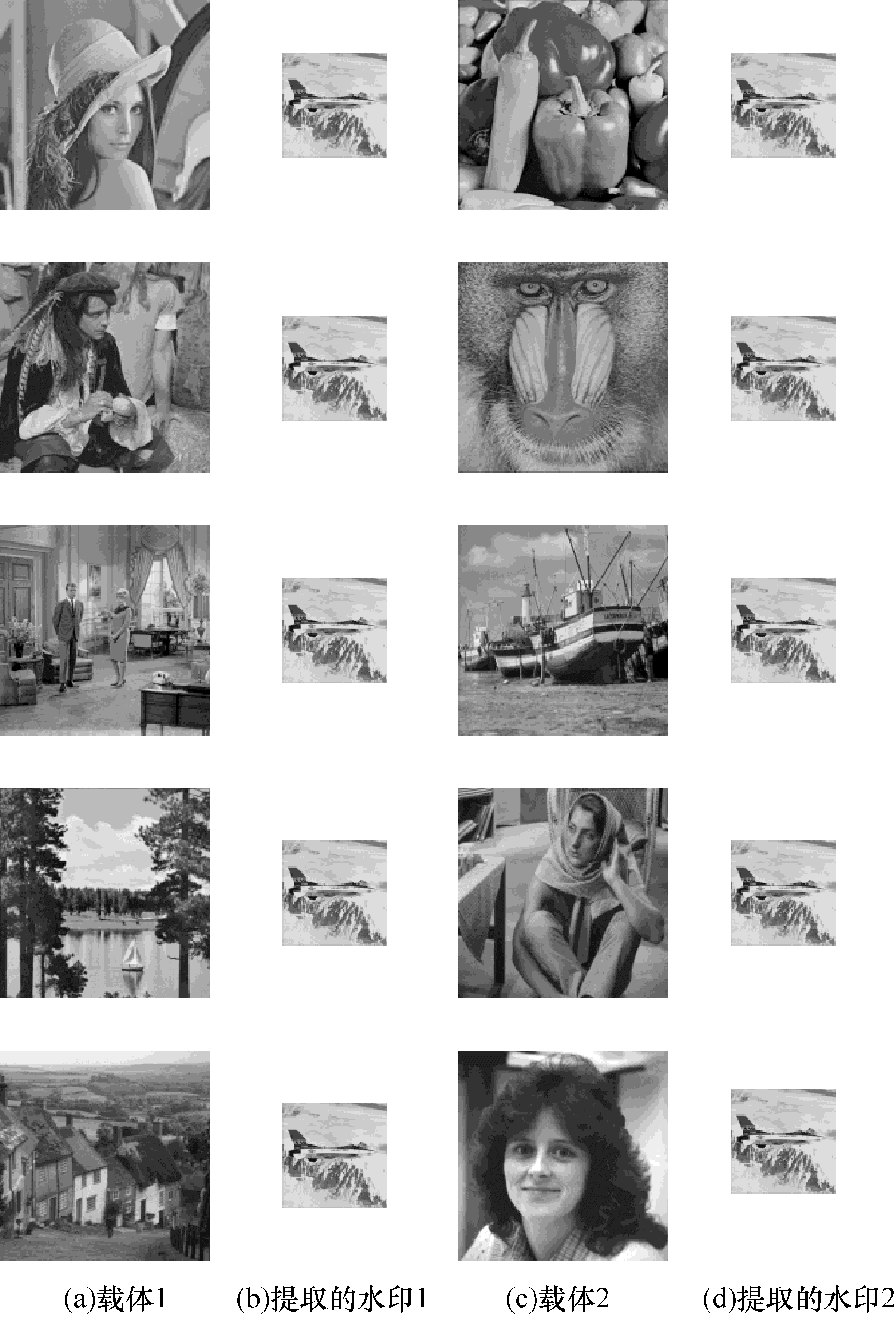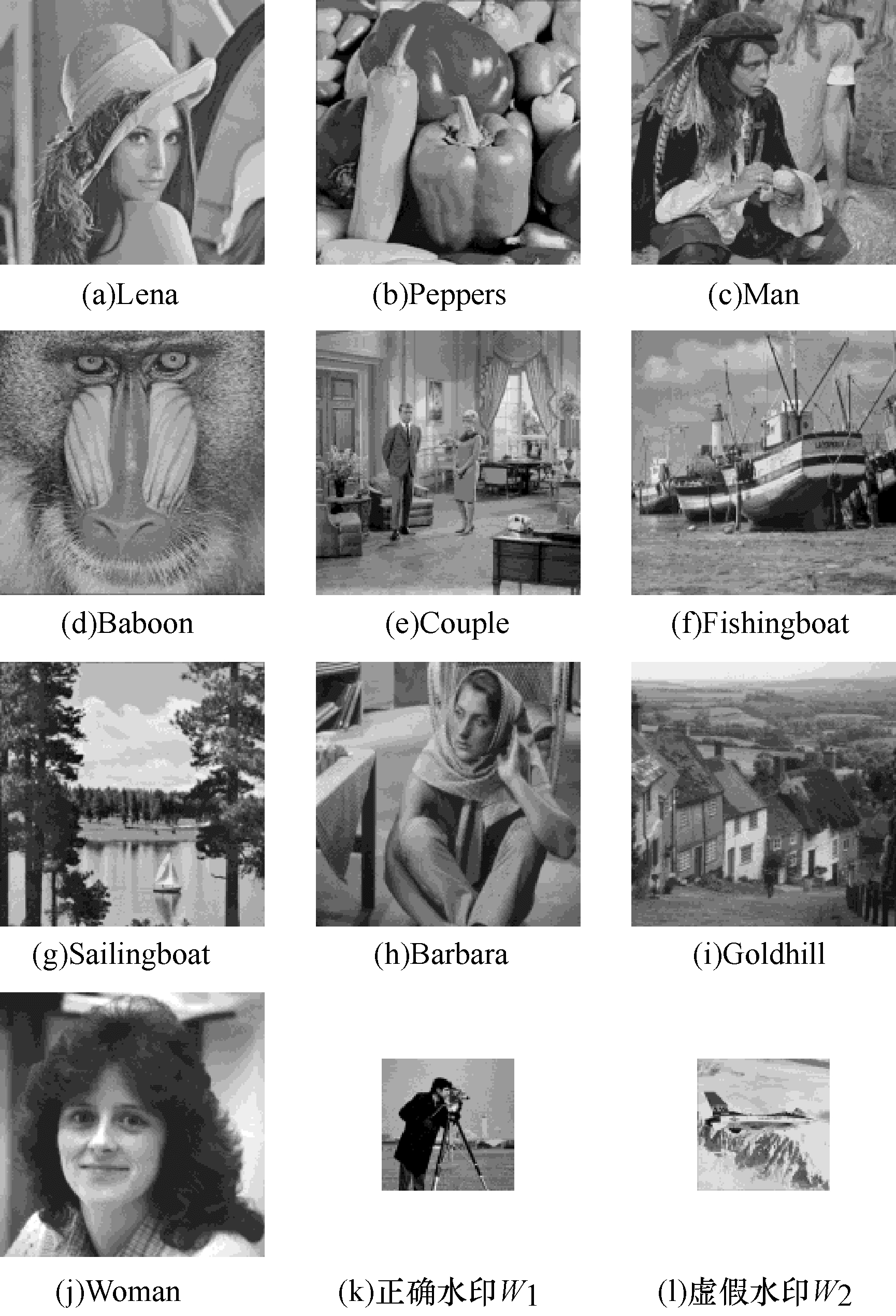 3 实验结果与分析从第2节得知, 攻击者构造的伪边信息可使用文献[19]提出的方法从任意图像中提取出虚假水印。为验证这一结论, 本节选取如图 3所示的10幅512×512图像作为载体图像, 2幅256×256图像分别作为真实水印与虚假水印。本文采用式(11)所示的归一化相关系数(NC)作为衡量2个水印之间相关性的标尺。