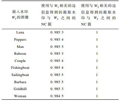 为进一步验证文献[19]方法存在虚警问题, 本文基于第1节的嵌入方法在载体中嵌入真实水印W1, 再根据本文的构造方法利用上一步得到的水印图像构造伪边信息, 最后从水印图像中提取水印。表 1第1列是不同载体与水印W1得到的水印图像, 第2列显示使用与W1相关的边信息得到的提取水印与W1之间的NC值, 第3列显示利用与W2相关的伪边信息提取出的水印与W2之间的NC值。