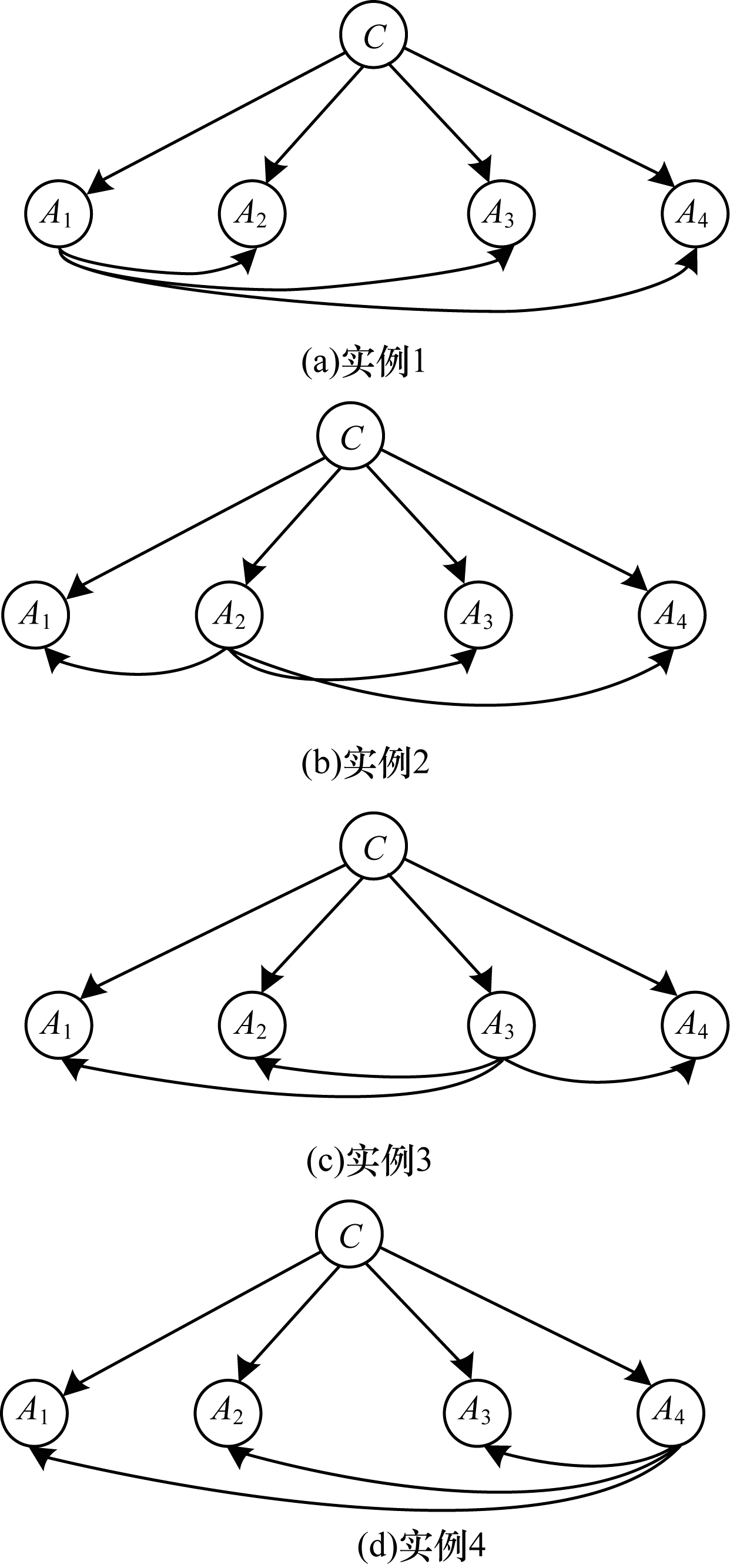 1.1 一依赖估测器模型建模ODE模型在建模过程中, 对每一个属性节点构建了一个特殊的树扩展贝叶斯网络拓扑结构, 每个拓扑结构就是一个ODE分类器,ODE分类器的个数取决于属性变量的个数。在每个ODE模型中, 类变量是所有属性变量的父亲节点。同时,遍历每个属性节点作为父亲节点构建多个树拓扑结构, 在每个树结构中每个属性有且仅有一个属性父亲节点。假设属性变量个数为4, AODE模型结构如图 2所示。其中, A1、A2、A3、A4表示4个属性变量, C表示类变量, 其是每个属性节点的父亲节点。