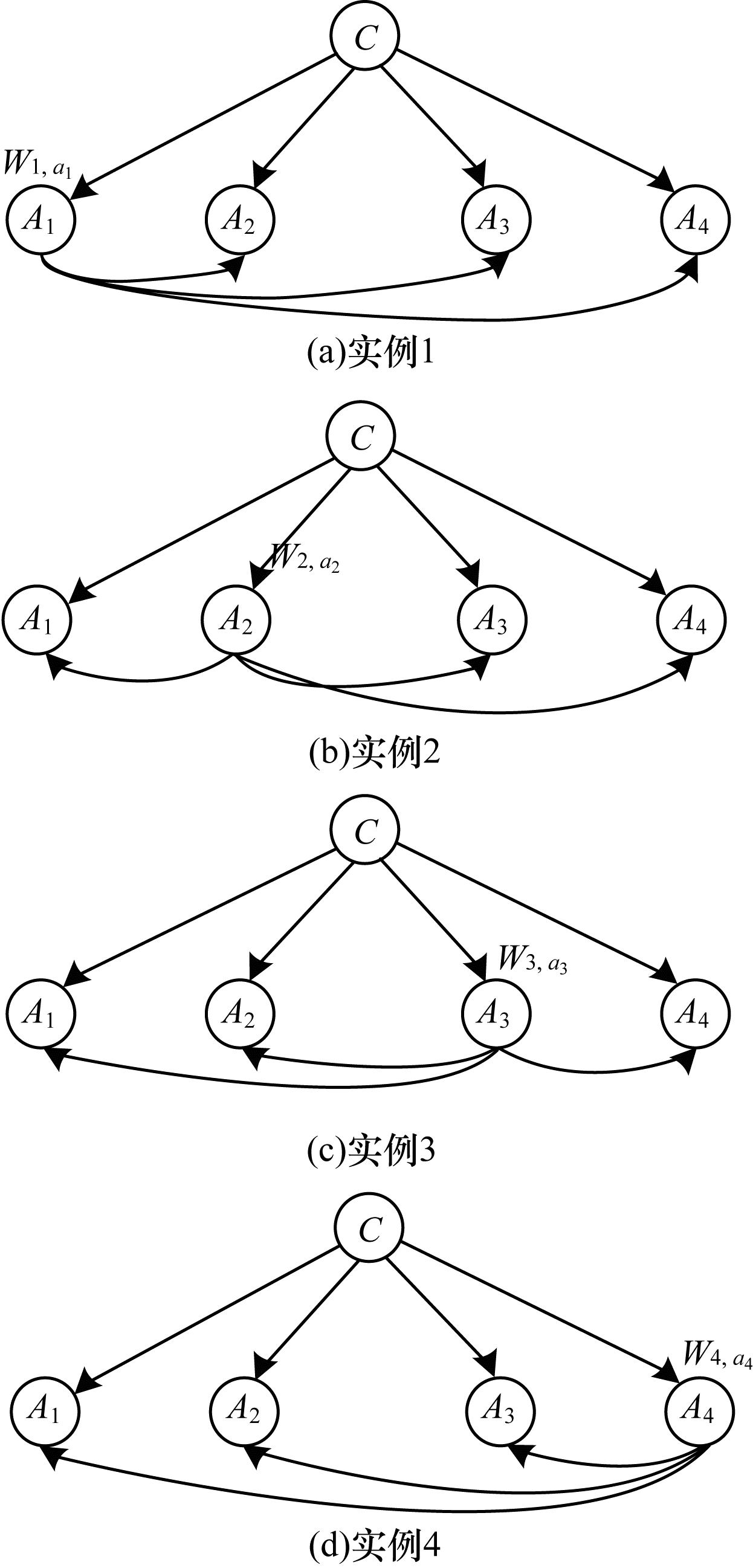 1.2 属性值加权方法研究MI-ODE算法对ODE模型采取属性值加权方法进行研究, 改变了现有算法对每个ODE模型进行算术平均的现状。综合考虑不同属性作为根节点时不同ODE模型对分类过程的不同贡献。本文算法利用相互信息作为信息度量方式, 计算属性值父亲节点和类变量之间的依赖关系, 对ODE进行属性值加权。对依赖关系大的ODE模型分配大权值, 同时给依赖关系小的ODE模型分配小权值。属性值加权的ODE模型结构如图 3所示。其中, A1、A2、A3、A4表示4个属性变量, 类变量C为每个属性节点的父亲节点,Wi, ai表示第i个属性作为父亲节点, 且属性变量的取值为ai时对应ODE模型的权值。