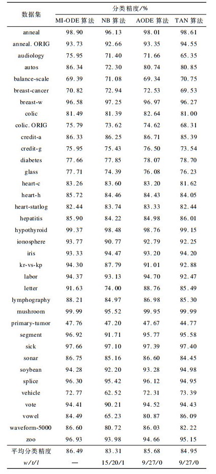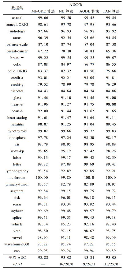 2.2 实验设计与结果分析以预处理后的36个UCI标准数据集为研究对象, 借助WEKA实验平台以及Eclipse软件完成实验。实验比较了MI-ODE算法、NB算法、AODE算法以及TAN算法的分类性能。为了更准确地评估本文提出的MI-ODE算法的分类性能, 对所有算法均设置了相同的数据集、相同的实验平台以及相同的评估方法, 且实验均采用10次十折交叉验证法, 并采用置信度为95%的t-test统计测试方法[23]对算法的分类精度以及AUC[24]指标进行分析比较。4种算法的分类精度结果如表 1所示, AUC指标结果如表 2所示。其中, 表 1和表 2中的w/t/l值是指MI-ODE算法相对于其他算法, 在置信度为95%的t-test统计测试方法下得到的比较结果。w表示MI-ODE算法的分类精度高于其他算法的实例集总数量, t表示MI-ODE算法的分类精度与其他算法相等的实例集总数量, l表示MI-ODE算法的分类精度低于其他算法的实例集总数量。
