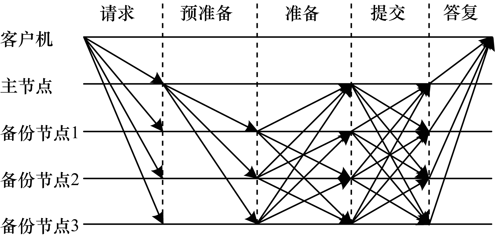 5) 答复。备份节点接收到法定数量的提交消息后执行请求操作, 并向客户端发送答复消息。客户端若收到f+1个不同备份节点的正确答复时, 则认为请求得到执行。