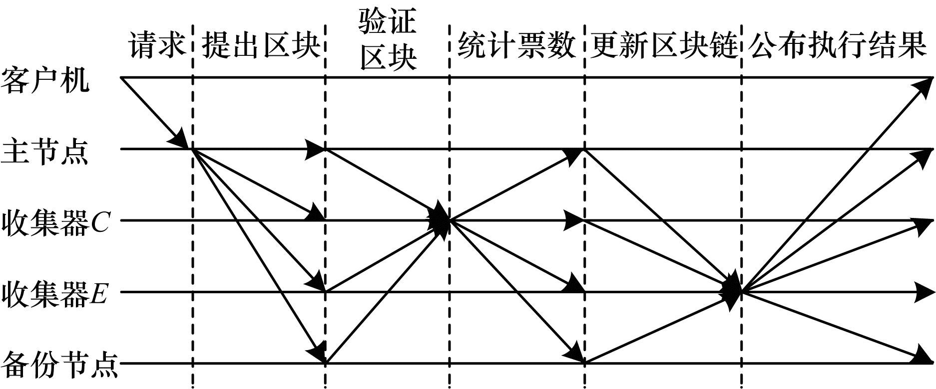 6) 公布执行结果。收集器E收集更新区块链消息并对其合法性进行验证。若收集到f+1个不同且合法的更新区块链消息, 则发送执行结果消息给客户机和所有节点。