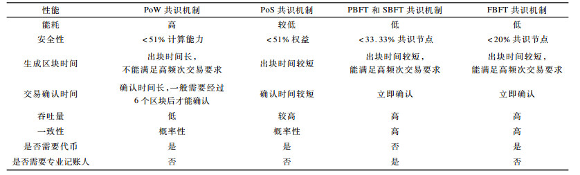 共识机制主要考虑安全性、扩展性、能耗、吞吐量、交易确认时间和一致性等性能。安全性是指抵抗双花攻击、日蚀攻击等安全威胁的能力[5]。扩展性是指系统支持扩展的能力, 主要考虑节点数量和交易数量增加时系统负载和网络通信量的变化。能耗是指每年挖矿消耗的电能。吞吐量是指系统中每秒可以容纳的最大交易量。交易确认时间是指从交易上链到被确认需要的时间。一致性是指系统抵御分叉的能力。