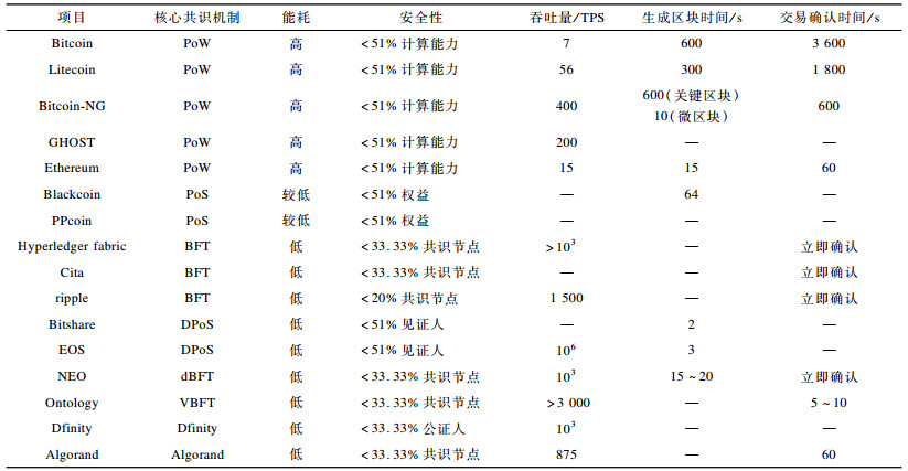 Algorand共识机制随机选举出块节点和验证节点, 能够抵抗恶意攻击, 去中心化程度和安全性高, 吞吐量高于Bitcoin, 交易确认时间低于1 min。BA*共识机制类似PBFT共识机制, 资源消耗低, 每个步骤都要求拜占庭节点数少于f=⌊(R-1)/3」, 算法时间复杂度为O(n2), 但其至少需进行6轮通信, 通信开销高于PBFT共识机制。