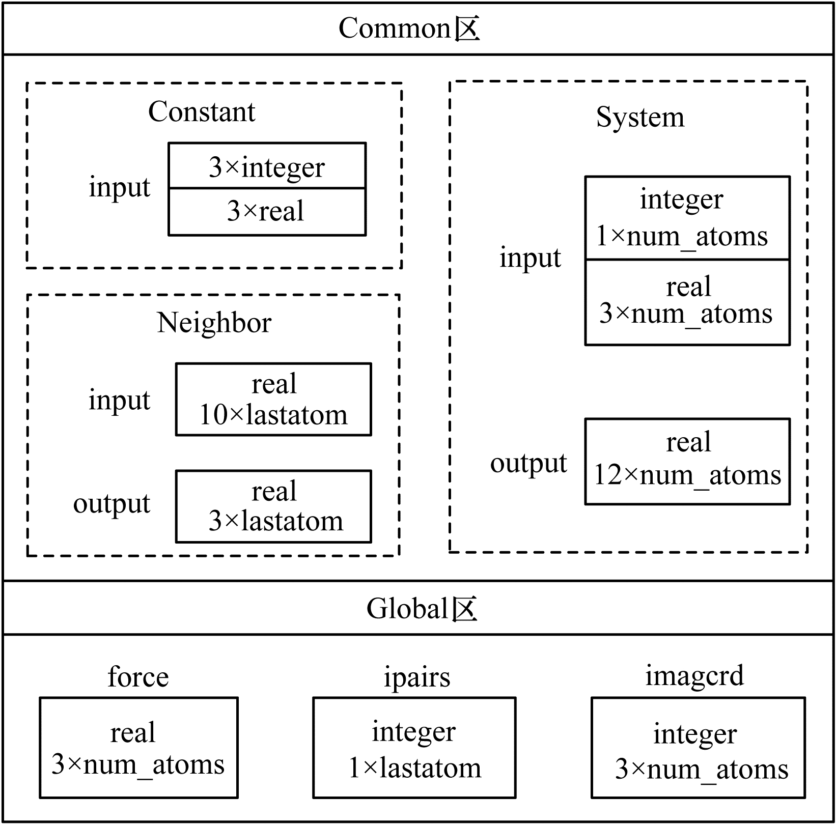由图 3可以看出, 在计算非键力前, 首先将AMBER自身维护的动态内存分配方式改为固定内存分配方式, 分为存放常量参数的Constant区(包含用于输入的3个整型(integer)数据和3个实型(real)数据)和存放系统原子参数的System区以及存放邻居原子参数的Neighbor区(包含系统总原子个数(num_atoms)和ipairs邻居列表长度(lastatom)的若干integer和real数据, 用于相关输入和输出), 这些内存空间均被标识为Common, 以供从核计算访问。在从核并行计算前, 由主核访问主存中的Global区从而对input标记的Common区的部分内存进行数据初始化, Global区中包含存储最后结果的force数组、邻居列表ipairs及其他相关参数信息。在从核并行计算完成后, 从核将计算结果更新到output标记的Common区。在调整算法中的数据结构后, 将进行热点计算部分的从核并行化。