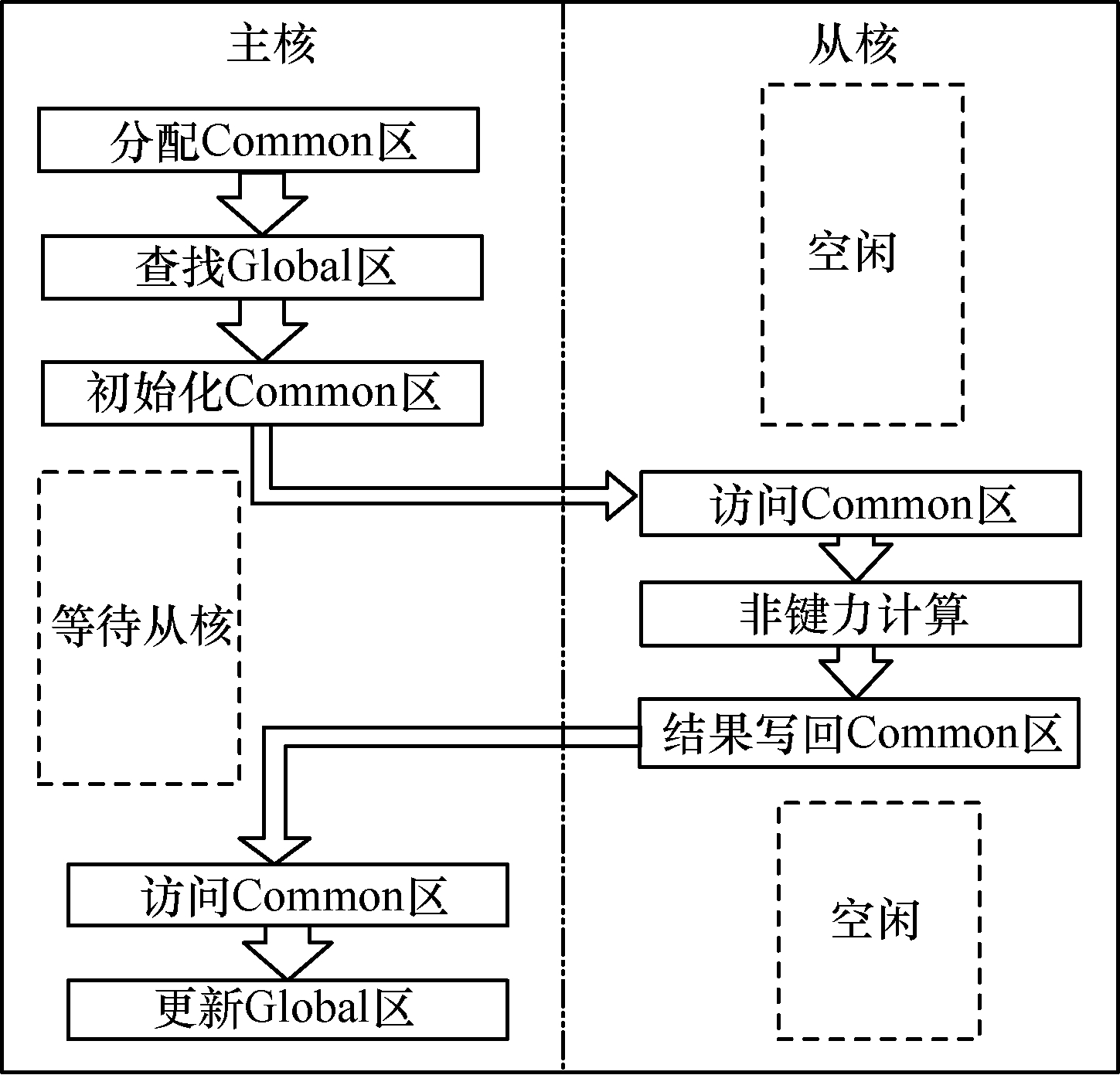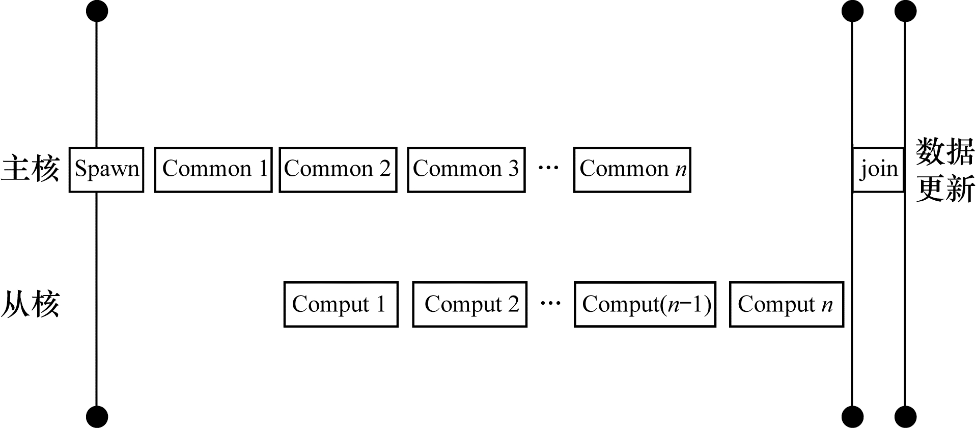 当主核为原子i的Common i区初始化完成后, 该区标志为真, 从核检测到标志为真即可开始计算Compute i, 而当从核计算Compute i时, 主核进行Common(i+1)区的数据初始化。因此, 主核Common(i+1)区数据初始化可与从核计算Compute i并行执行, 实现主核数据初始化与从核计算两个模块的流水化操作, 从而消除部分等待时间。