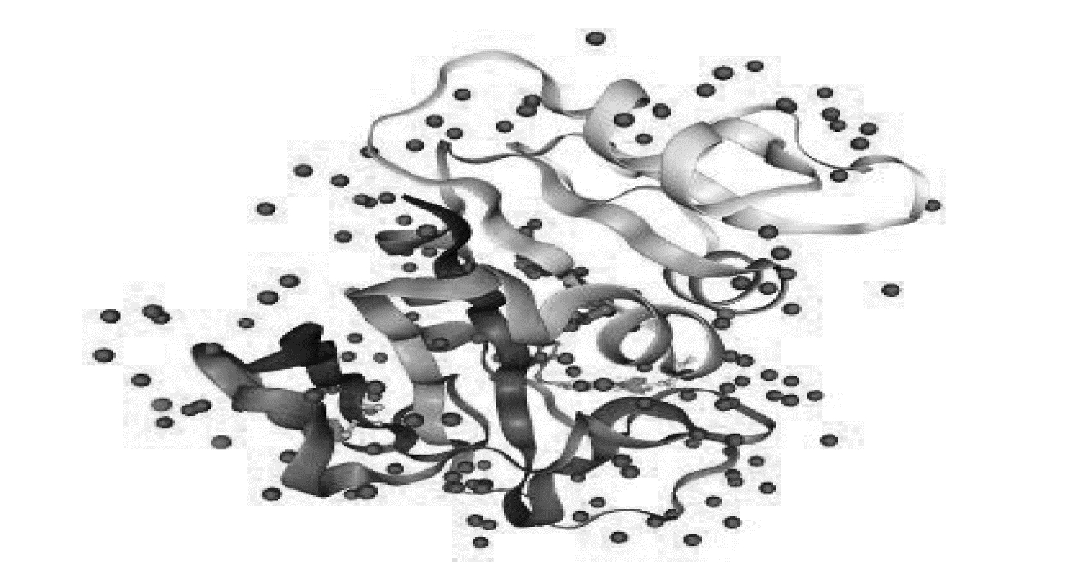 测试算例选择AMBER软件的DHFR测试基准, 结构如图 6所示, 包含23 558个原子, 单位迭代时间步长为2 fs, 短程非键力截断半径为8 angstrom。