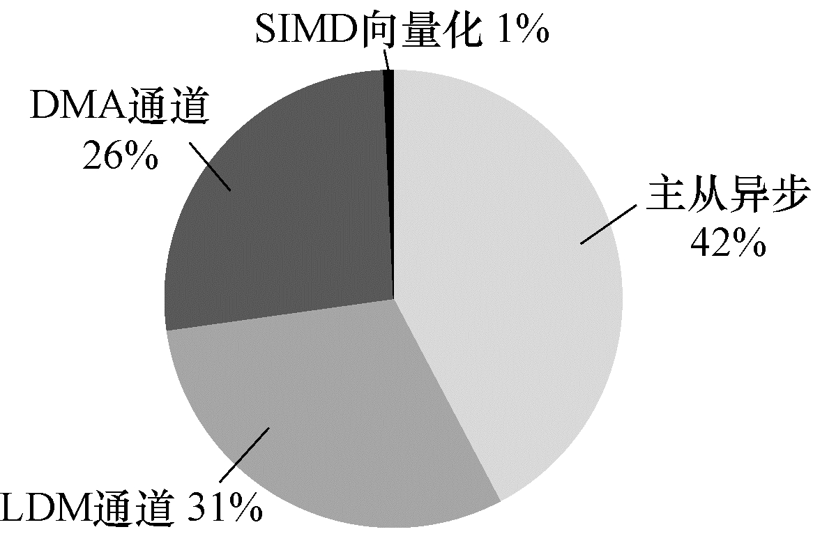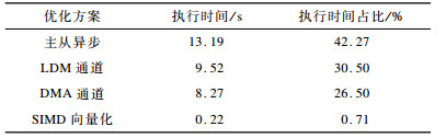 可以看出, 不同优化方案对性能的加速效果不同, 如图 8所示, 针对从核访存(LDM+DMA)的优化占了总优化时间(31.20 s)的50%以上, 通过测试分析可以为后续在神威太湖之光平台上移植与优化其他软件提供借鉴与指导。