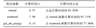 2 商用平台上的热点分析与测试在移植与优化AMBER软件前需先对其进行测试与分析, 找出sander模拟程序的热点计算部分[22]。本文通过在Intel商用平台上模拟二氢叶酸还原酶(DHFR)得到热点函数执行时间占比如表 1所示。